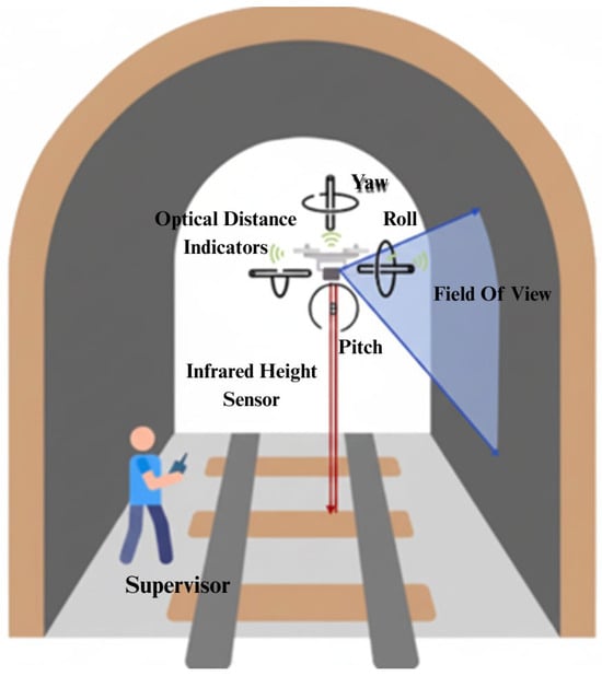 Ivić et al. [44], in their work about visual inspection of complex structures like bridges and wind turbines, suggest a multi-UAV trajectory planning for 3D visual inspection. This would save time, be safer, and save money. They also say that the method could be used for motion control if it could be made more computationally efficient. Ottaviano et al. [45] propose the use of a robotic rover for visual inspection of damages in dangerous and limited-access areas, utilizing inbuilt sensors that enhance accuracy and reliability. Lee et al. [46] carry out a complete survey on the various types of robots employed in the visual inspection of structures and categorize the robots used. He suggests unmanned aerial vehicles (UAVs) as the best choice for robot-based visual inspection considering the advantages they offer in reliable results. Zhang et al. [47] have proposed a method called PMPP-SD, which involves using UAVs to collect images in a grid pattern from various views and angles for defect detection in the tunnel surface, as illustrated in Figure 3. Researchers have tested the method’s effectiveness in an environment akin to a railway tunnel.