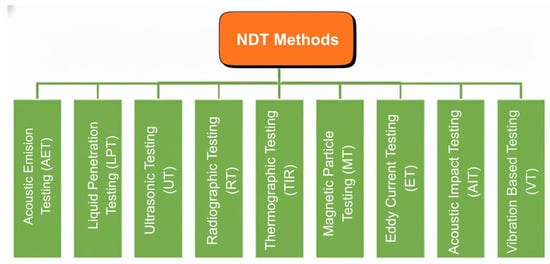 Non-destructive testing has a wide range of applications in areas like manufacturing and fabrication industries, the oil and gas industry, power generation plants, aerospace and aviation, rail and transportation, civil engineering, and infrastructure. When inspecting and evaluating civil infrastructures, non-destructive testing (NDT) is an essential tool. NDT is used to identify damage and improve the utility period of reinforced concrete buildings. It can also be used for restoration to preserve aesthetic and historic value [52]. Cracks, corrosion, delamination, voids, weld discontinuities, and material deterioration are a few flaws that can be detected using NDT. NDT covers methods including acoustic emission testing (AET), liquid penetrant testing (LPT), ground penetrating radar (GPR), thermographic testing (TT), and ultrasonic testing [53,54,55], as shown in Figure 4.