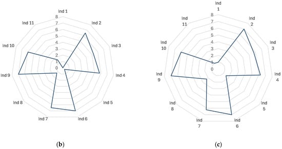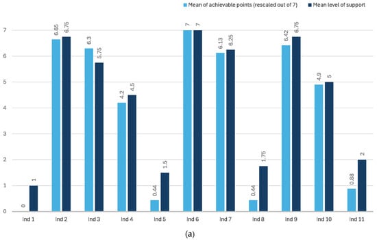 Since LEED assigns different point values (or weights) to each indicator, and in order to enable direct comparisons among indicators in terms of “achieved/achievable” points, the achieved points for each indicator as measured in Q1 were normalized to a common 7-point scale. Specifically, the “achieved/achievable” points for each indicator were divided by its assigned weight and then multiplied by 7, such that the resulting values ranged from 0 to 7. This procedure yields normalized values, comparable across indicators without altering their internal proportional relationships.