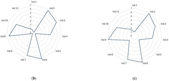 Table 3 presents a summary of the experts’ assessment of Revit’s support for each indicator using the two measures (Q1 and Q2) in round-2 of the survey, while Figure 4 provides a graphical representation of the same data using bar and radar charts. In round-2 of the survey, the two items (Q1 and Q2) measure the experts’ evaluation of Revit’s potential capability to support any of the available options/requirements for each EA indicator as specified in the LEED documentation based on their expertise in the field. As such, both in this round of the survey, Q1 and Q2 measures capture subjective data, as they represent experts’ opinions regarding Revit’s potential to support any of the available options for LEED criteria, including the options/sub-indicators not adopted in the case study. As done in round-1, the mean of achievable points in Q1 is rescaled to be out of 7 for comparison purposes.