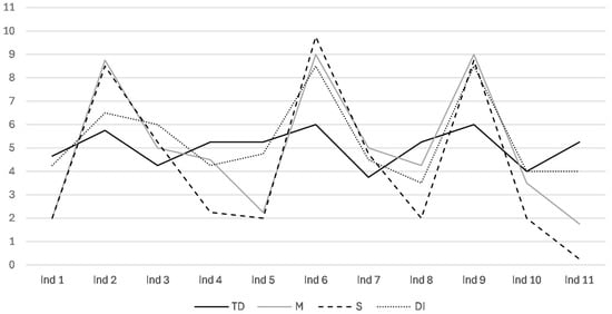 Four Revit media channel types were evaluated: text documentation (TD), modeling (M), simulation (S), and data integration (DI). Table 5 summarizes the importance/effectiveness ranking of the Revit media channel in supporting LEED EA indicators as assessed by the experts. Figure 6, on the other hand, presents a line chart of the data in Table 5.