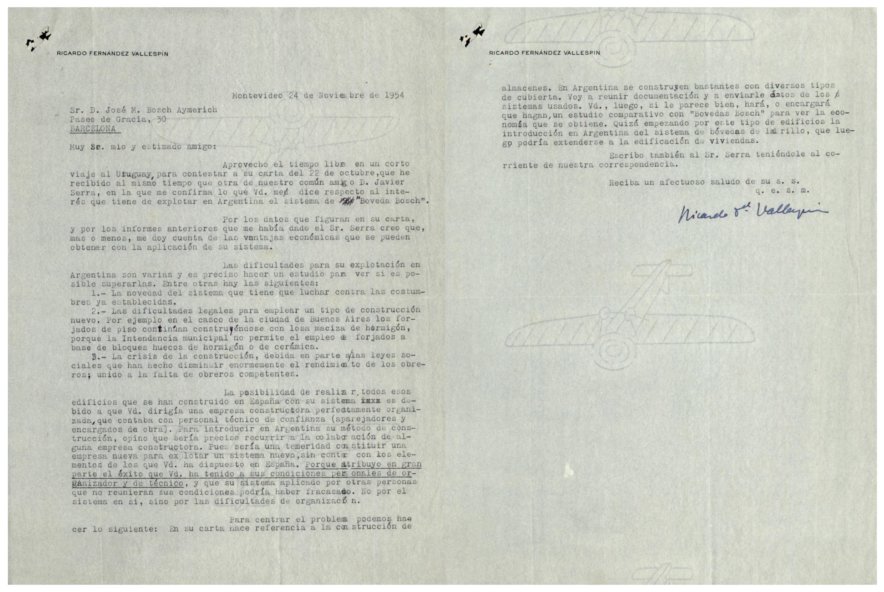 “The possibility of constructing all those buildings that have been built in Spain using your system is due to the fact that you ran a perfectly organized construction company, which had reliable technical staff (quantity surveyors and site managers). In order to introduce your construction method in Argentina, I believe it would be necessary to seek the collaboration of a construction company. It would be reckless to set up a new company to exploit a new system without the resources you have had at your disposal in Spain. I attribute much of your success to your personal qualities as an organizer and technician, and believe that your system, if applied by others who do not meet your standards, could have failed. Not because of the system itself, but because of the difficulties of organization”[16] (p. 520).
