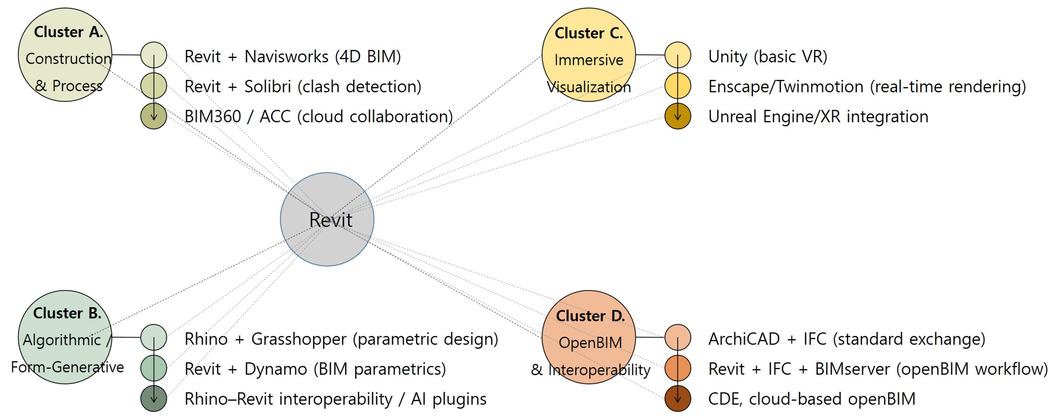 | A. Construction & Process | Revit + Navisworks (4D BIM) | Revit + Solibri (clash detection) | BIM360/ACC (cloud collaboration) | Process-based BIM shifts to cloud-based collaboration |