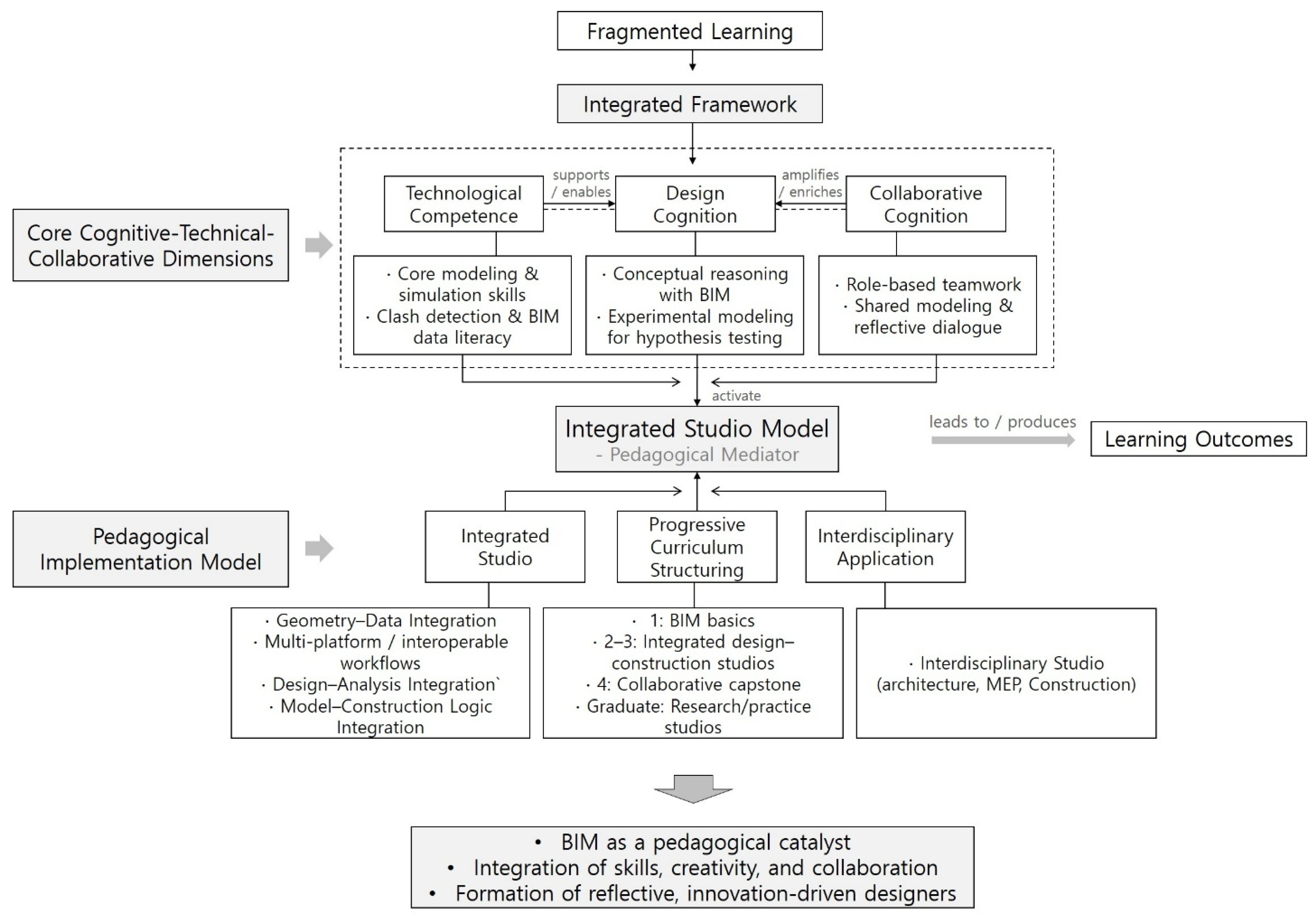 | 5. Collaborative and Interdisciplinary Challenges | ∙ Persistent disciplinary silos between architecture, engineering, and construction programs ∙ Lack of communication and coordination skills ∙ Insufficient exposure to real-world team workflows | ∙ Interdisciplinary design studios and collaborative projects ∙ Role-based learning simulating IPD environments ∙ Integration of virtual and cloud-based collaboration ∙ Reflection on teamwork, leadership, and BIM management roles |