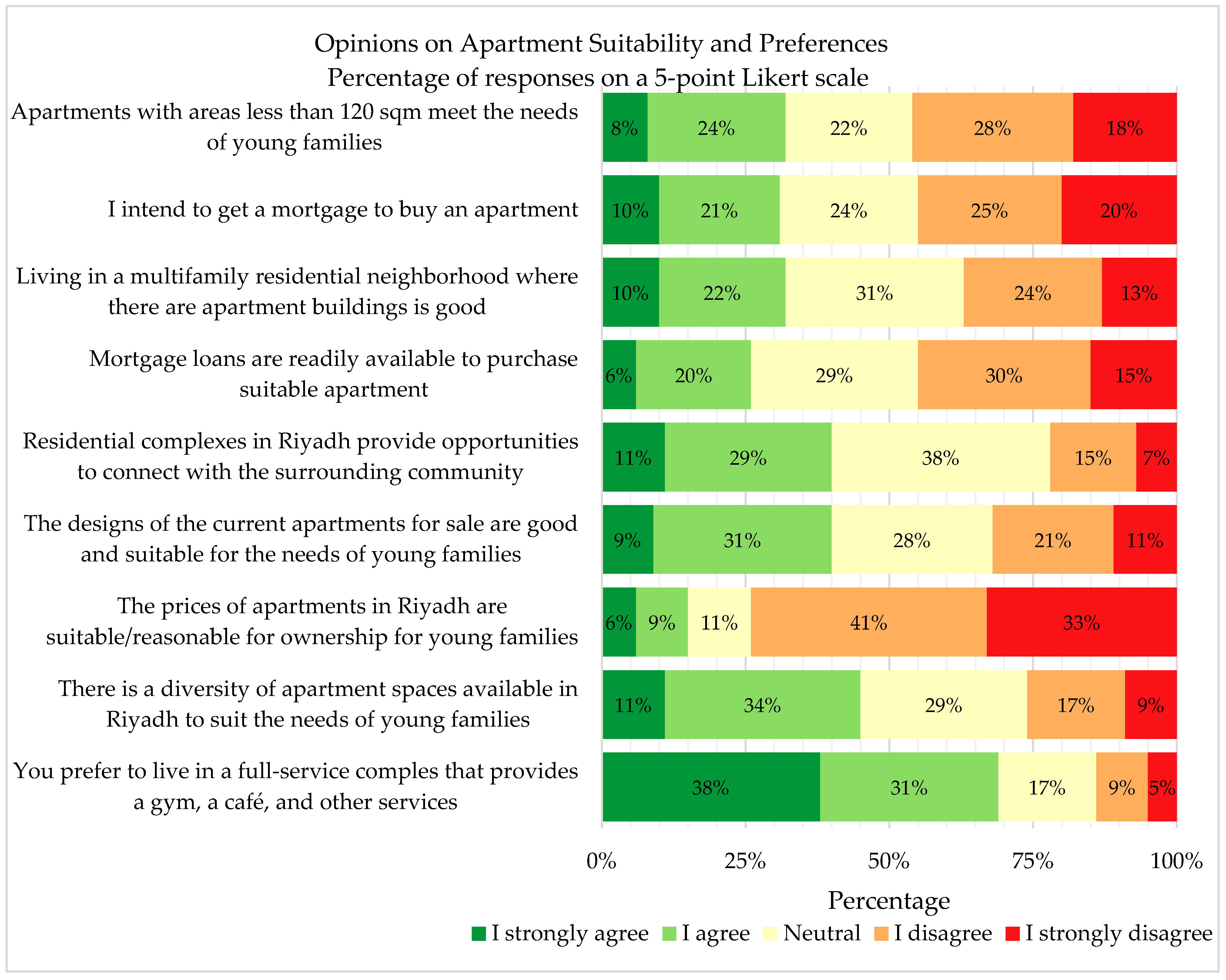 Figure 3 shows how respondents evaluated apartments through a five-point Likert scale which ranges from strongly disagree to strongly agree. This shows that affordability and financing issues continue to affect respondents while they want better designed apartments with additional features. Nearly half of respondents (46%) disagreed or strongly disagreed that apartment prices in Riyadh are affordable for young families. A similar proportion (45%) expressed concern about the limited availability of mortgage loans. Although 31% agreed that they could secure a mortgage, opinions were evenly divided. Apartment size preferences were mixed: about 40% considered small units (below 120 m