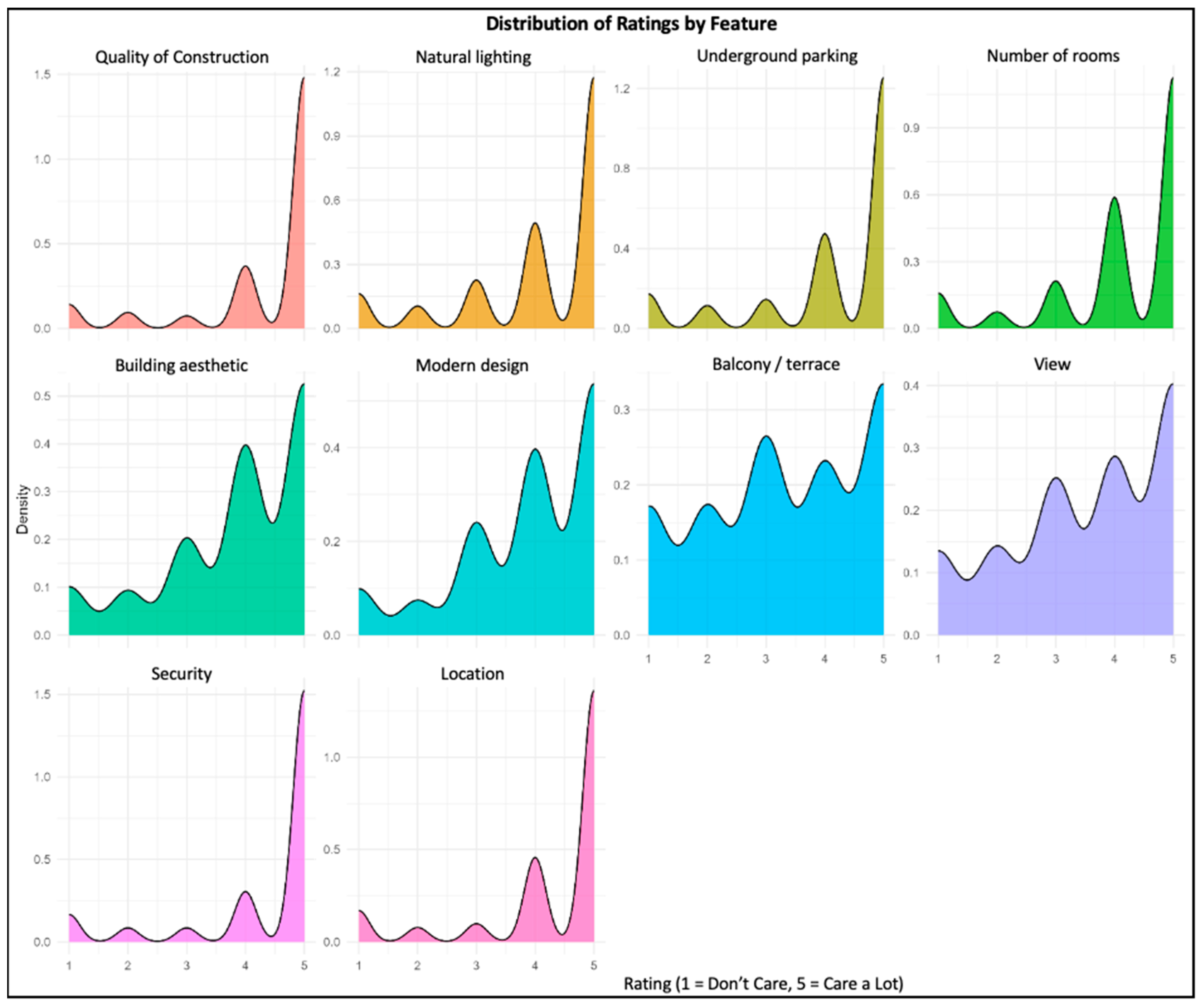 Figure 4 shows how respondents rated ten apartment features in Riyadh, based on a five-point Likert scale (1 = “I don’t care”, 5 = “I care a lot”). The kernel density curves show the relative importance respondents assign to each feature. The most distinct peaks appear at the highest rating (5), indicating that participants clearly prioritise the features of number of rooms, quality of construction, security, underground parking, location and natural lighting when selecting apartments. Features such as building aesthetics and modern design also exhibit right-skewed distributions, suggesting that visual and stylistic qualities matter to a large proportion of buyers, but slightly less than spatial and structural considerations.