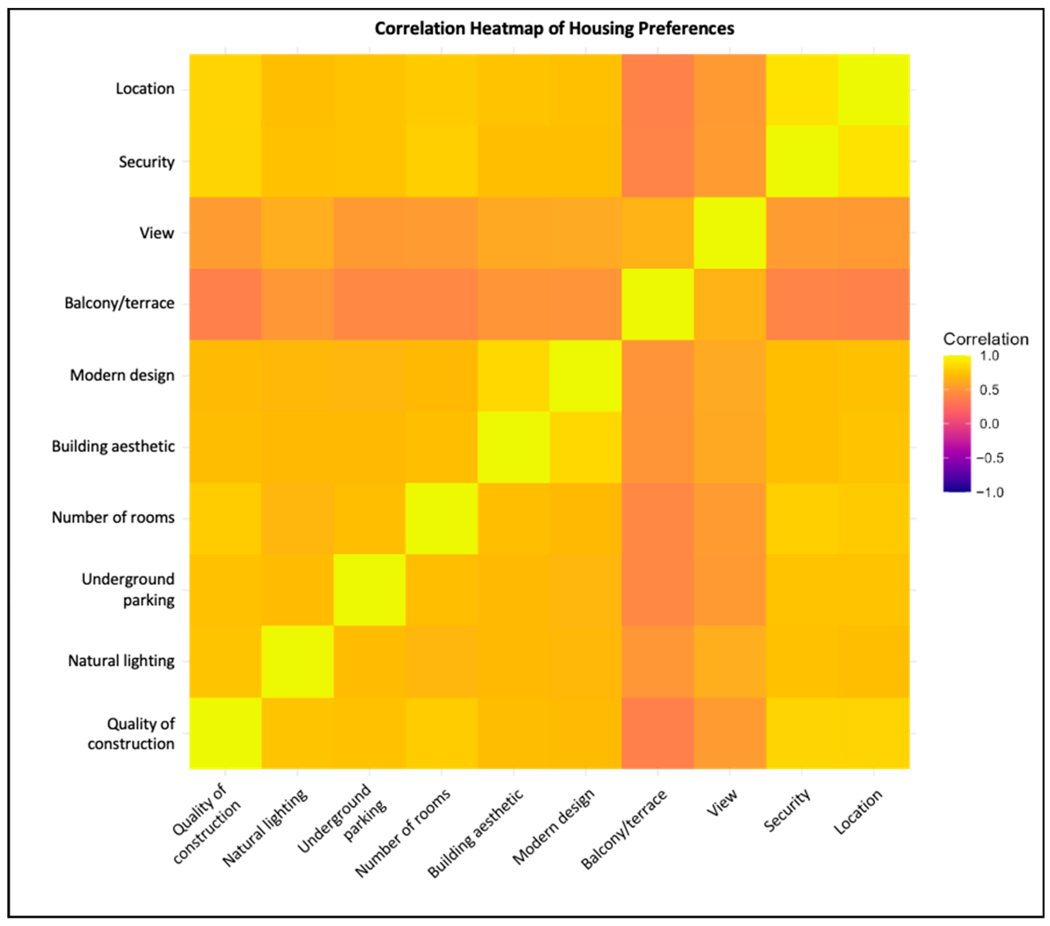 Figure 5). Each relationship strength appears as color intensity where higher brightness indicates stronger connections. For example, respondents who value quality of construction in their housing decisions also highly value number of rooms, security and location. Interestingly, the correlation between security measures and residential locations demonstrate a positive relationship, suggesting that good neighborhood placement makes properties appear safer. On the other hand, numerous variables show weak associations, demonstrating that outdoor spaces (Balcony/terrace) contribute more negatively to overall house quality judgments. These findings demonstrate how architectural features and personal preferences affect homeowners’ selection of homes and could inform future residential architecture in Riyadh. While this analysis does not test H1 directly, the relationships between perceived quality, spatial needs, and security reinforce the broader role that economic expectations and purchasing capacity play in shaping residential evaluations, as expected in H1.