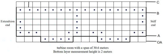 (2) The vertical height of the turbine room’s operating floor is approximately 21 m. Along its height direction, there are almost no pipes or equipment arranged. Therefore, the method of hanging temperature self-recording instruments at different heights and on different planes was adopted for testing, and multiple vertical sections were selected throughout the operating floor space (Figure 5).