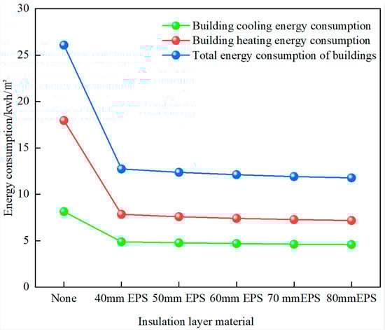 (2) Energy consumption simulation analysis shows that building energy consumption is closely related to the thickness of the exterior wall insulation layer. When the exterior wall insulation material was changed from no insulation (with a thickness of 0 mm) to 50 mm thick flame-retardant polystyrene foam board (EPS), the reduction in building energy consumption was the most significant. When the thickness of the insulation layer exceeds 50 mm, the reduction in building energy consumption tends to level off. Therefore, 50 mm thick flame-retardant expanded polystyrene (EPS) boards represent the optimum insulation thickness. The energy consumption per unit area decreasing by 13.72 kWh/m2, and the energy-saving rate reaching 52.59%.