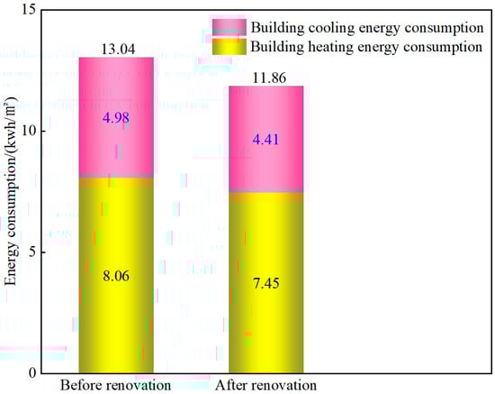Energy consumption simulations of the building were conducted using the GBSWARE software. A comparative analysis of energy consumption data before and after the renovation reveals that the energy-saving renovation measures have significantly reduced the building’s energy consumption. Specifically, the heating energy consumption of the renovated building decreased by 10.50 kwh/m2 compared to the existing building, the cooling energy consumption decreased by 4.37 kwh/m2, and the total energy consumption of the building decreased by 14.87 kwh/m2 overall, with an energy savings rate as high as 56.2%, meeting the requirements of Chinese standards GB51245-2017 [29] and GB/T51141-2015 [31]. This result indicates that the energy-saving renovation measures have achieved significant in improving the thermal performance of the building and reducing energy consumption (Figure 15).