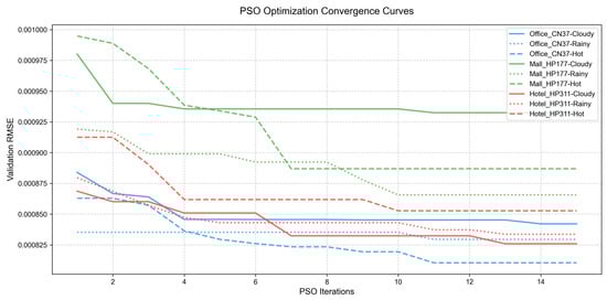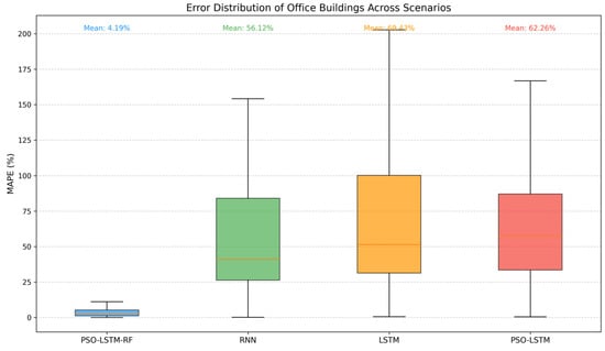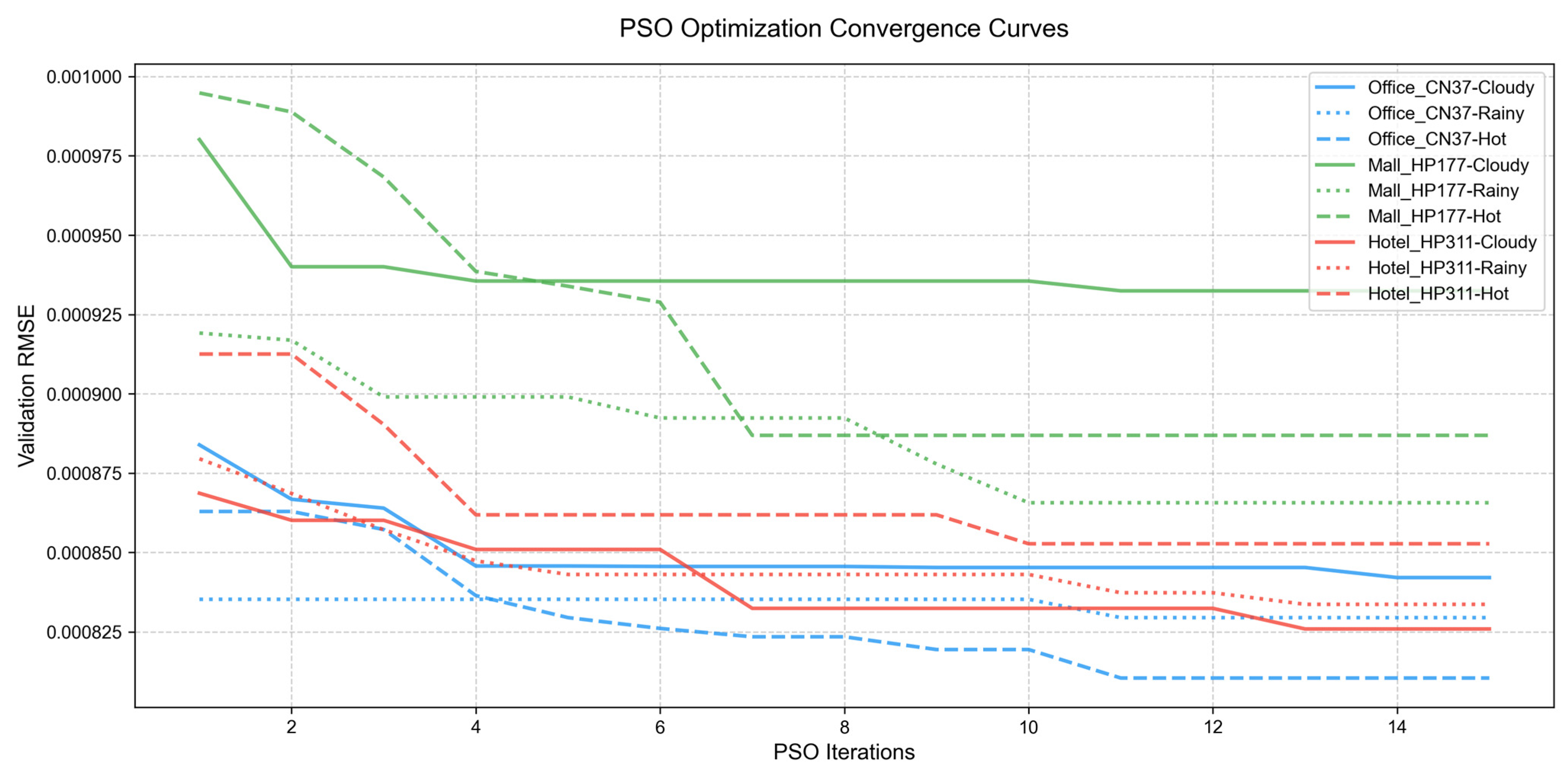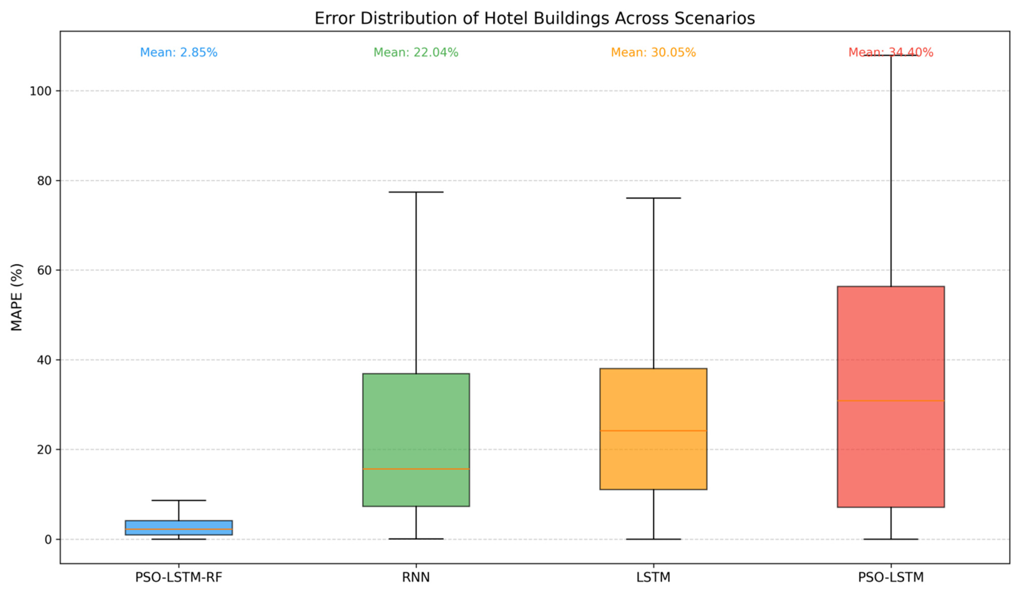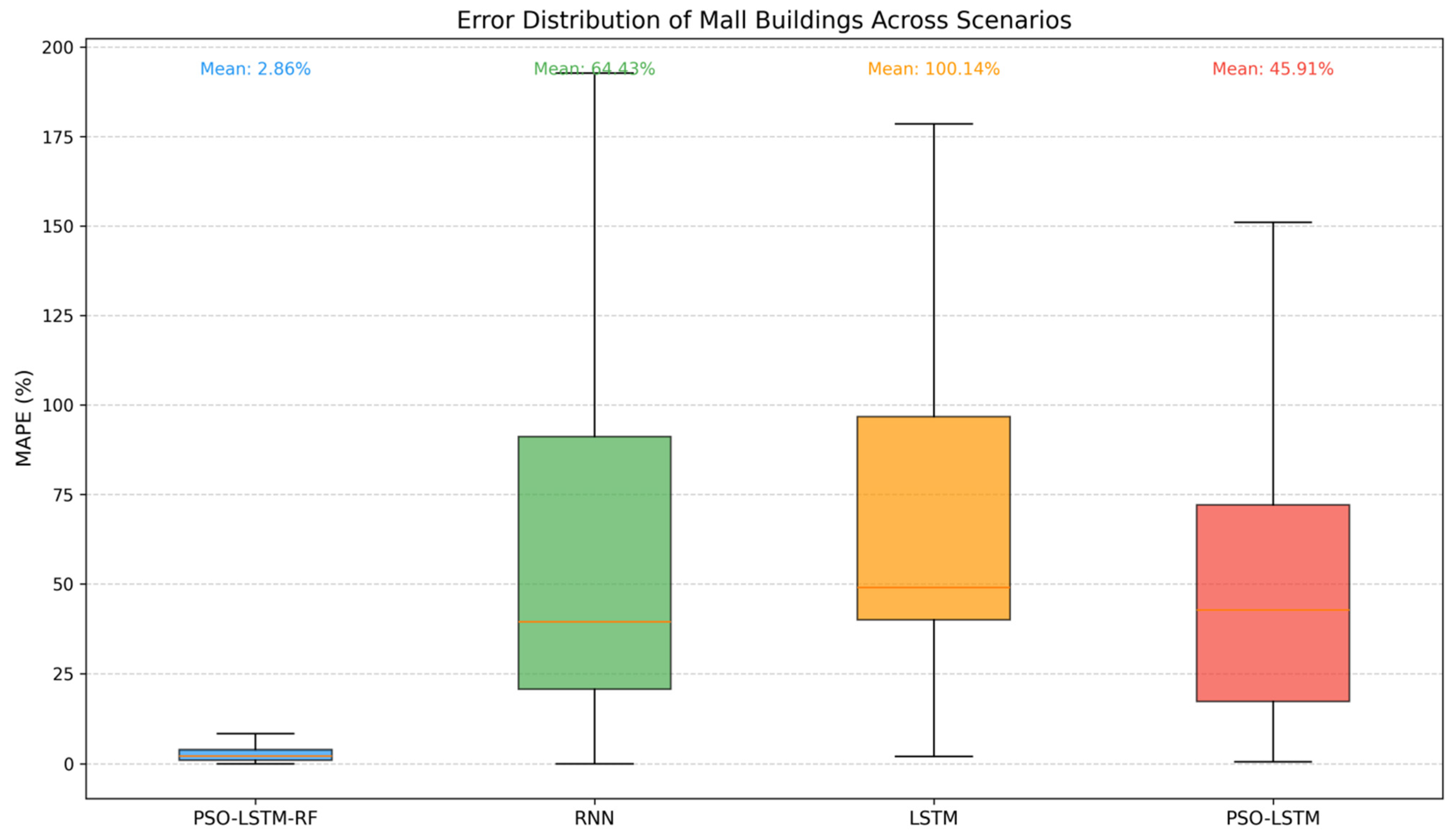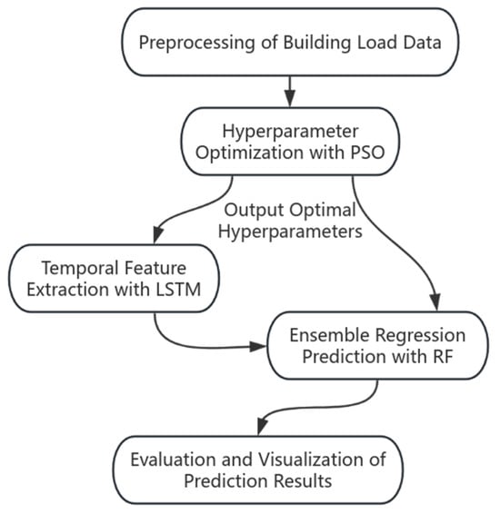 However, building energy consumption data are influenced by multiple factors, such as temporal and meteorological characteristics. A single forecasting model cannot achieve both accuracy and efficiency in this context. Therefore, this study proposes a PSO-LSTM-RF hybrid model that overcomes the limitations of a single architecture. The PSO algorithm provides global optimization, alleviating computational redundancy and overfitting risk; RF, leveraging the advantages of ensemble learning, strengthens the capture of nonlinear coupling relationships among multidimensional features such as weather and time, compensating for the LSTM’s limitations in modeling nontemporal interactions. Together, the three models form a closed loop of “temporal dependency capture–multifeature integration–adaptive parameter optimization”, retaining the LSTM’s core advantage in handling long sequences while enhancing adaptability to complex building energy characteristics through cross-model collaboration, ultimately achieving high-accuracy and low-redundancy load forecasting.
