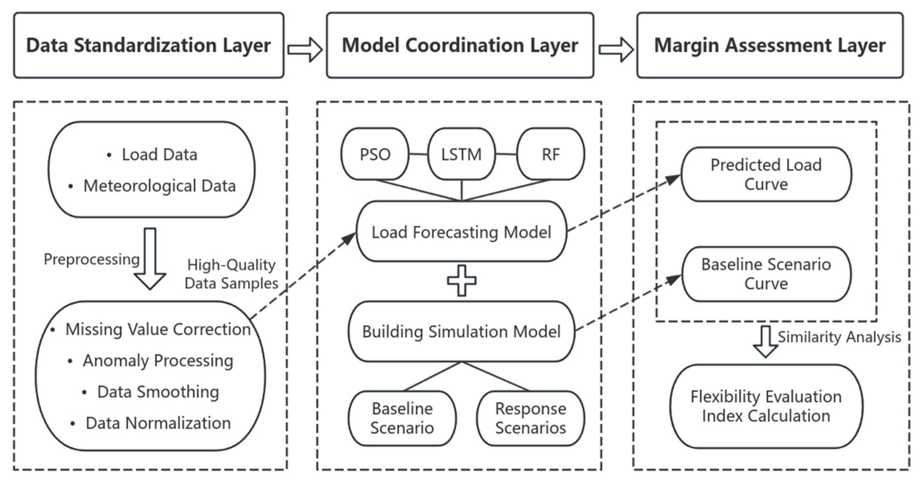 Table 1, existing studies have achieved notable progress in either high-accuracy load forecasting or detailed flexibility assessment using physical simulation. Nevertheless, these two research streams largely evolve independently. Load forecasting studies typically emphasize prediction performance without linking forecast results to executable flexibility indicators, while flexibility assessment studies often neglect predictive consistency with future operating scenarios.