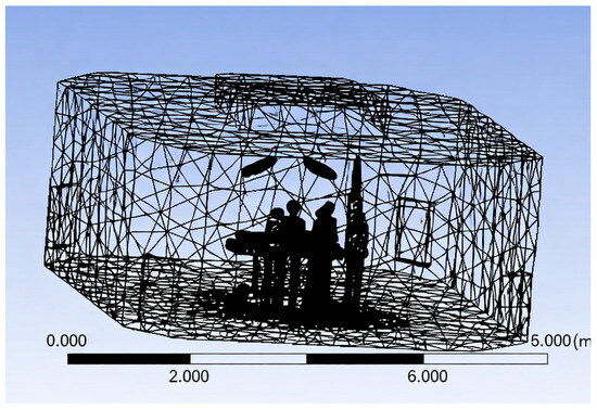 The fluid domain, representing the air volume within the room, was carefully meshed with attention to the regions surrounding internal features, such as mannequins, surgical lights, pendant arms, and diffusers (Figure 4).
