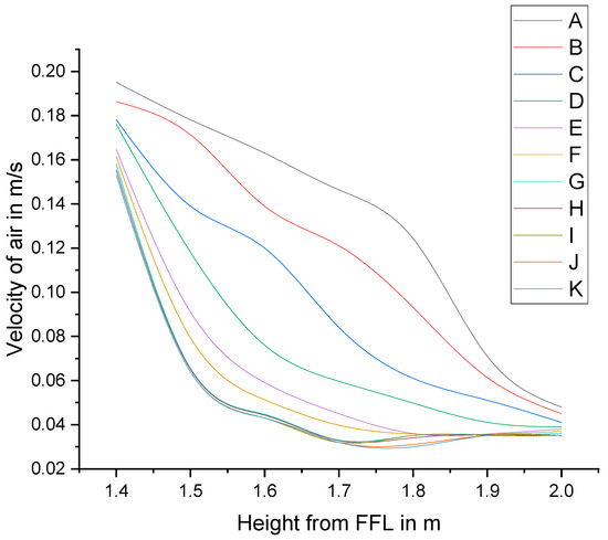 Simulations were performed using identical boundary conditions and solver settings for each mesh. Since the present study focuses on the local velocity of air at and above the surgical site, the local velocity of air in measured in a vertical line from the surgical site—approximately the mid portion of the bed—to a height of 2 m. The solution was considered grid-independent when the variation in the velocity between successive meshes dropped below 2% and the velocity profile was almost the same (Figure 6). The final analysis was completed with set J.