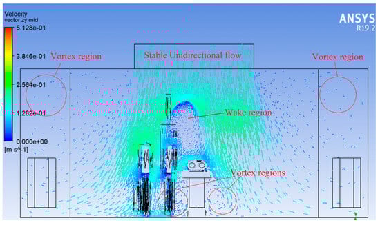 The observed recirculation zones near the sidewalls and lower boundaries correspond to low-velocity regions (<0.03 m·s−1), which, although typical in room-scale flows, should be minimised by optimising exhaust placement or diffuser design to prevent the accumulation of contaminants. The velocity symmetry about the room’s centreline indicates a well-balanced diffuser performance, supporting uniform environmental control.