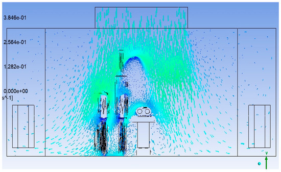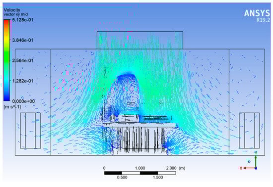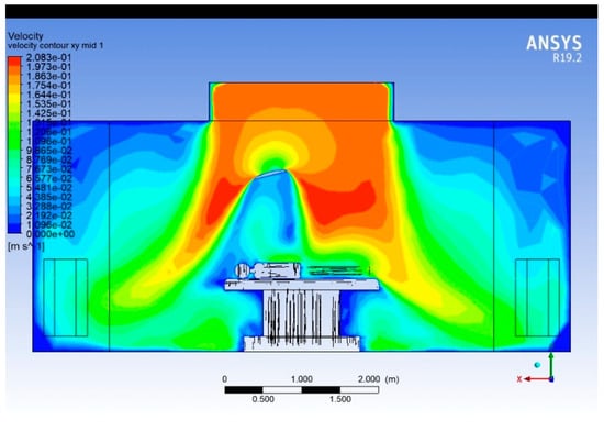 A similar diffuser arrangement—with a ceiling central laminar flow supply diffuser and lower level return grills at two opposing walls instead of four corners—was used by Liu et al. [27] in their attempt to find the effect of thermal plumes caused by human beings. The mannequins are arranged on both sides of the surgical table. The velocity vector plot shown in Figure 25 shows a similar pattern except for the absence of surgical lights. The circulating flow at the upper level of the room outside the LAF region is visible in the plot.
