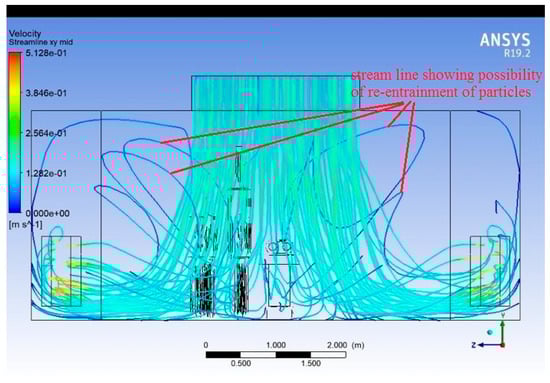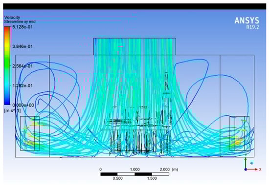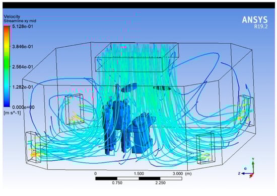 An interesting aspect that can be noted in the numerical study conducted by Nan Hu et al. [28] is the shifting of the recirculating region from the top corner of the room to the bottom corners. The velocity vector plots are not available with this study and, instead, the streamlines (Figure 26) are provided. The OR under study uses uni-directional flow inlets at the ceiling instead of a laminar flow diffuser that was used for our study.