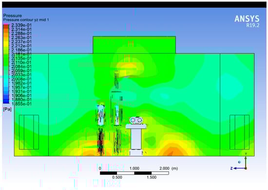 The nearly symmetrical pressure field further implies that diffuser configuration and exhaust placement are properly balanced, contributing to uniform air delivery and minimised stagnation zones. Localised high-pressure regions around equipment and lighting structures are acceptable as long as they do not disrupt the downward laminar airflow, and their influence can be mitigated through diffuser design optimisation.