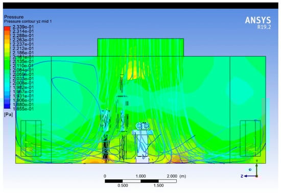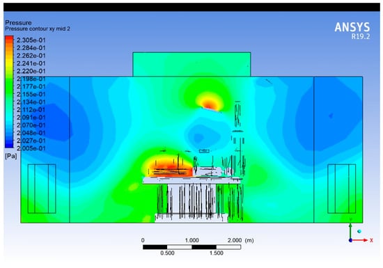 The door in its fully open condition is modelled as an opening—pressure outlet—with 2 m width and 2.2 m height (Figure 19). Figure 20 and Figure 21 show the pressure asymmetry due to the door opening.