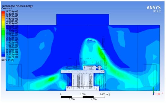 The sidewalls show predominantly low TKE (<1 × 10−3 m2/s2), confirming that the ventilation layout successfully confines higher turbulence to localised regions rather than the full room volume. However, the elevated TKE region near the right-hand wall indicates entrainment of airflow toward the exhaust, suggesting asymmetry in the flow distribution that may merit optimisation.