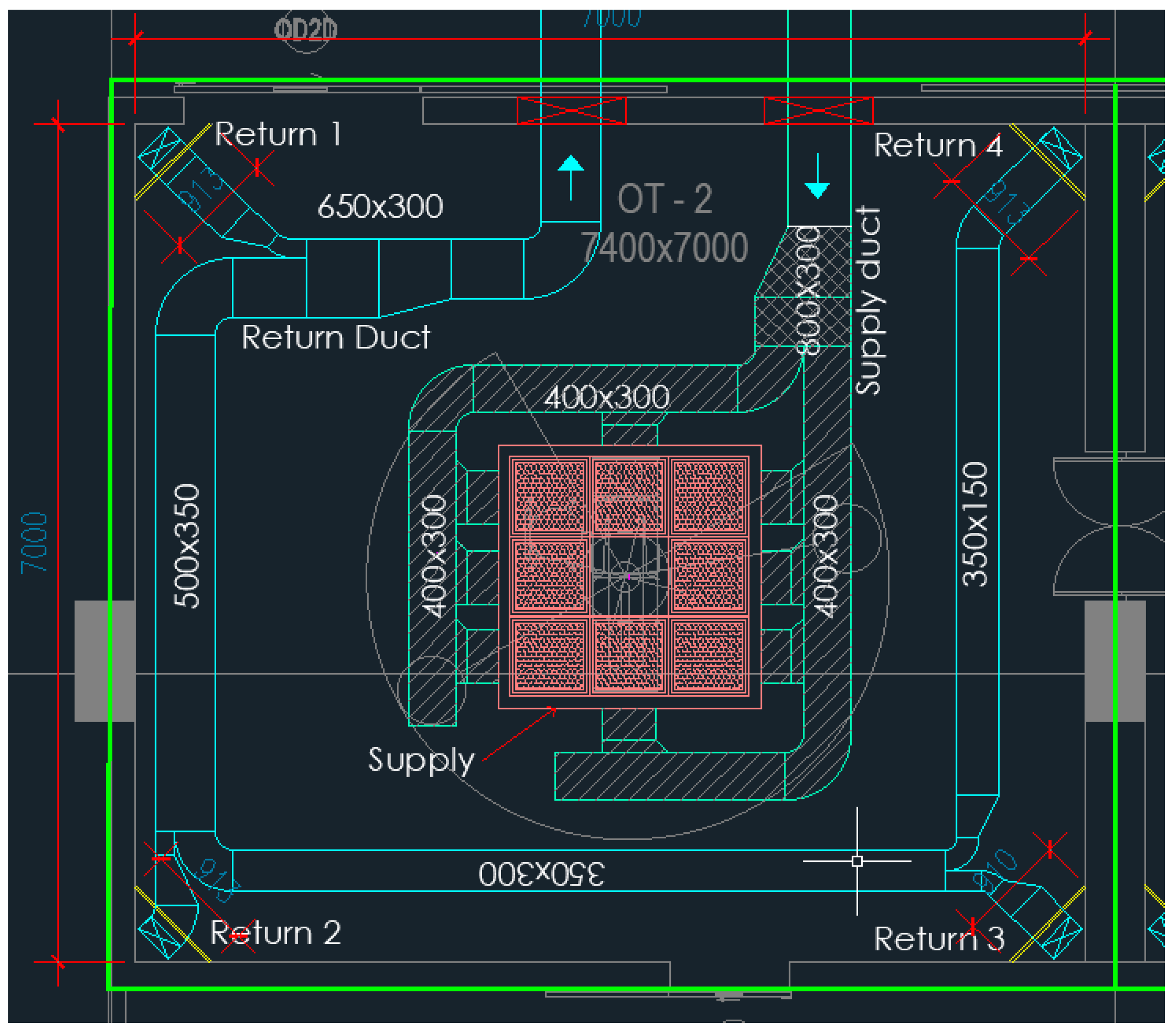 Figure 2 shows the HVAC ducting layout of the OR. The supply diffuser—called a laminar air flow diffuser—which has a terminal HEPA filter (efficiency 99.97% @ 0.3 µm particle) and four segments, which are connected to the supply duct. The supply duct carries air is treated psychrometrically and filtered with a 20-micron pre-filter and a 5-micron bag filter (Minimum Efficiency Reporting Value MERV 8) in a dedicated Air Handling Unit (AHU). The supply diffusers are placed at the geometric centre of the room above the patient table. The return diffusers of four numbers are placed at the four corners of the room, which are connected to the return duct running above the plenum.