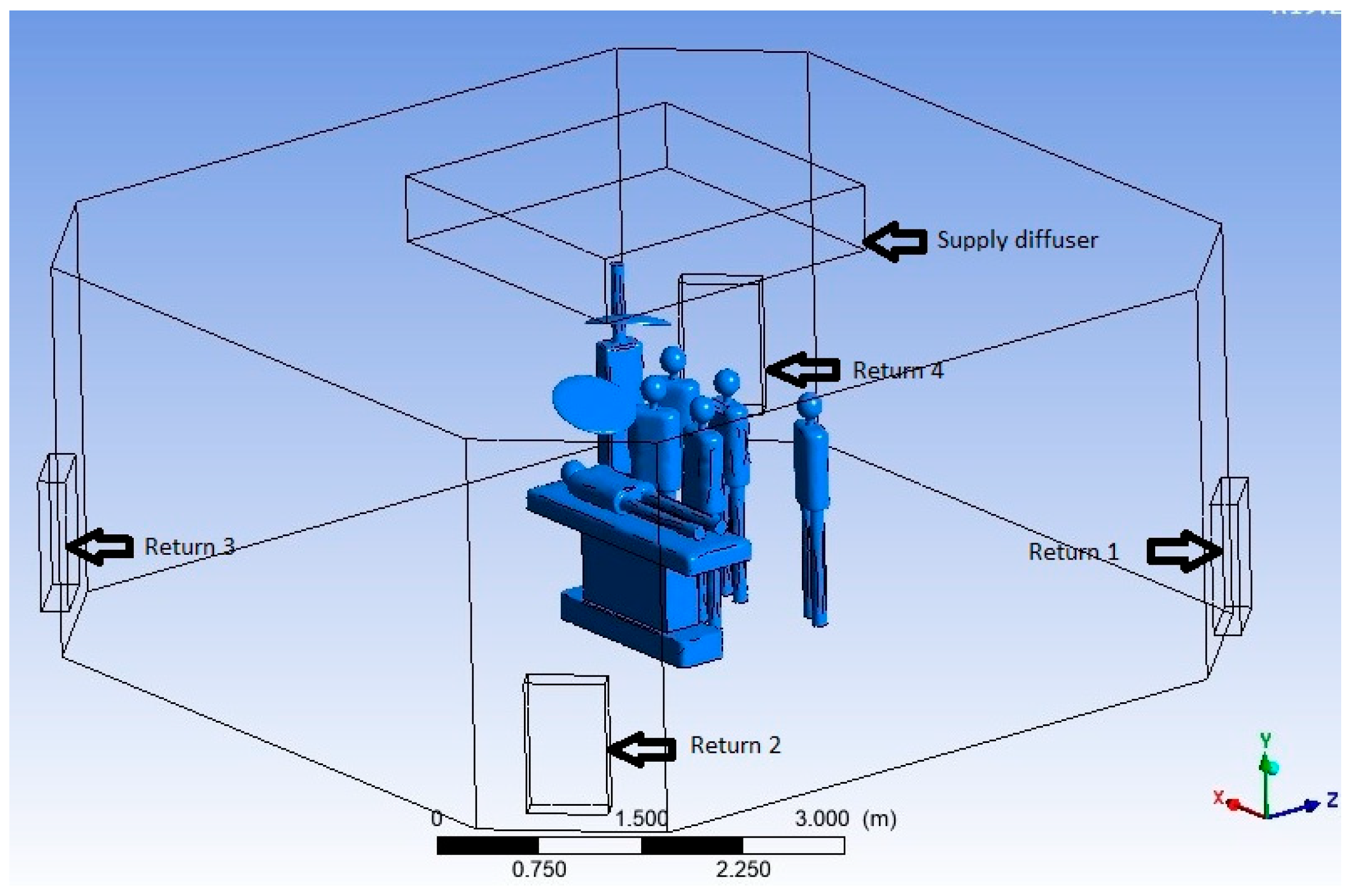 The fluid domain represents the air volume inside the OR with the dimensions specified in