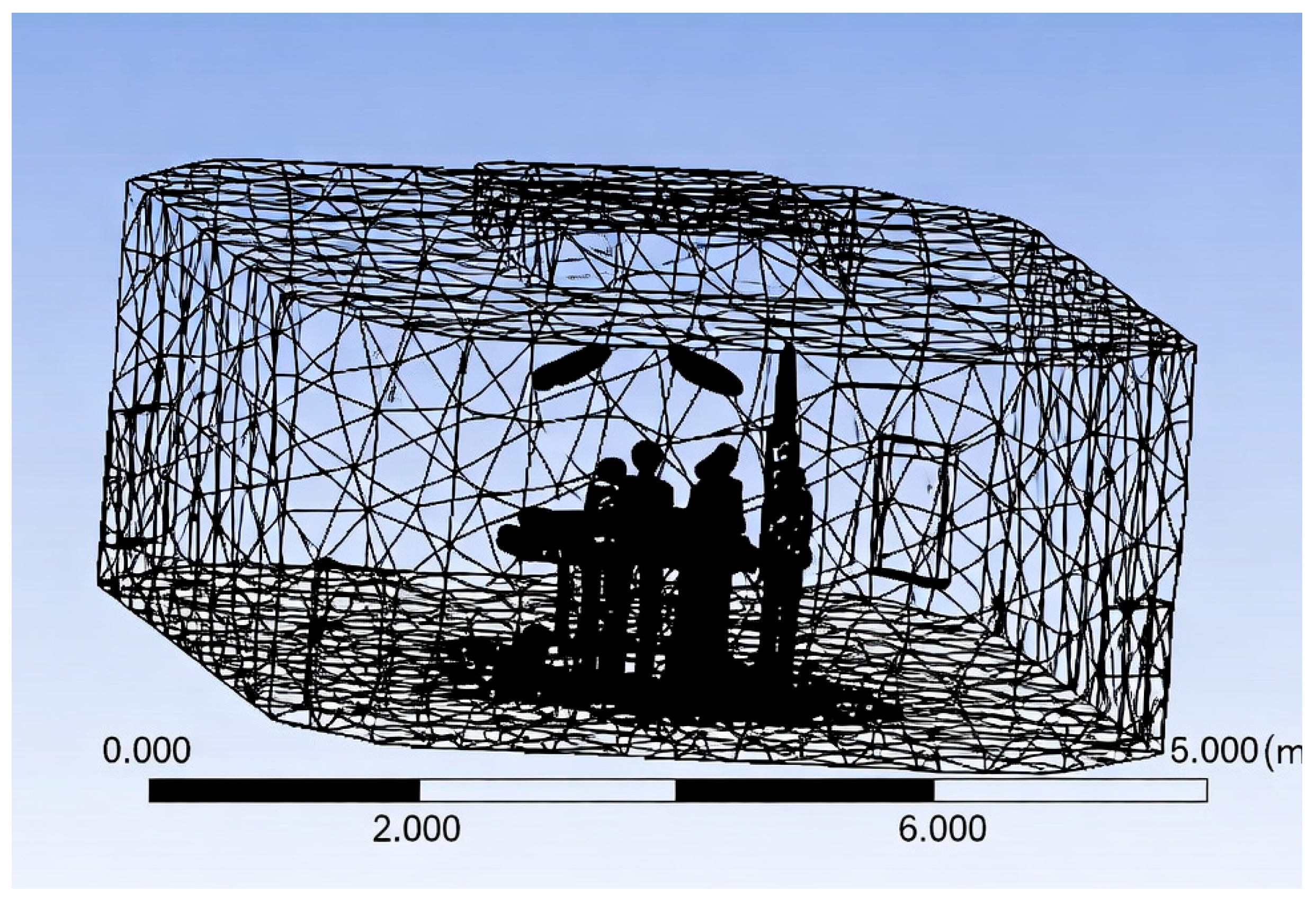 The meshing process plays a critical role in capturing the complex flow dynamics within the operating room environment. A high-quality mesh ensures accurate resolution of velocity, pressure, and thermal gradients around obstructions such as surgical lights, medical personnel, and equipment. The geometric model of the OR, developed in SolidWorks, was imported into ANSYS Meshing 19.2 for discretisation.