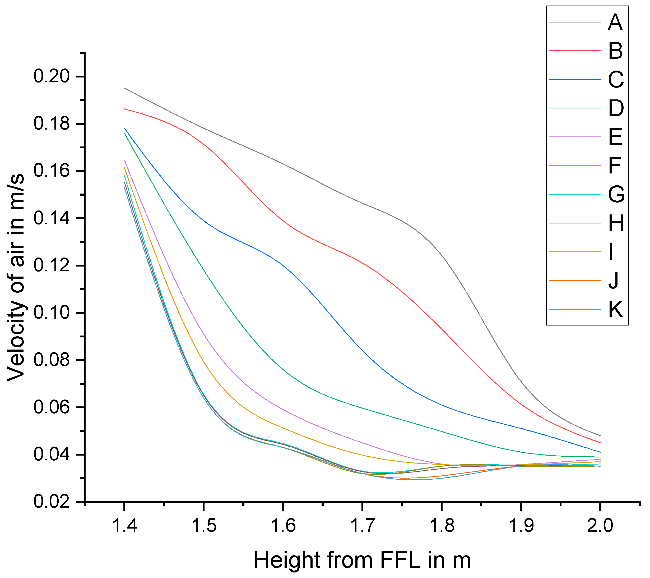 This plot visually highlights how airflow velocity is not consistently maintained across the width due to real-world elements, like personnel and equipment. Placement and design of supply and return diffusers must be reassessed to ensure higher flow consistency. Design interventions such as repositioning surgical lights or adding directional flow elements may help restore uniform flow fields.