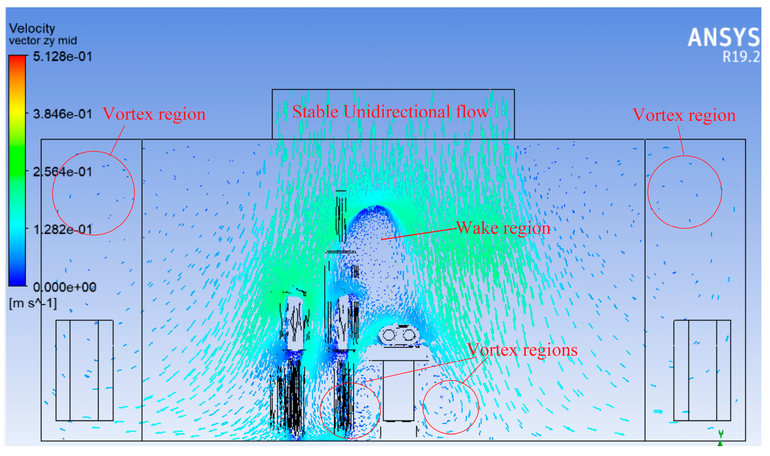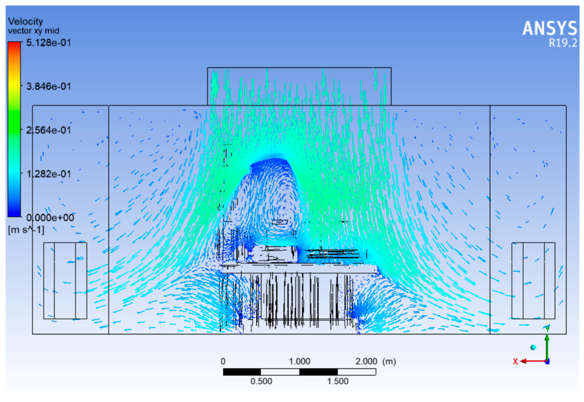 Figure 7 shows the velocity vector plot taken on a vertical plane passing along the width of the operating room, intersecting the centre of the operating table. This plane helps visualise airflow patterns in a cross-sectional slice perpendicular to the length of the OR.