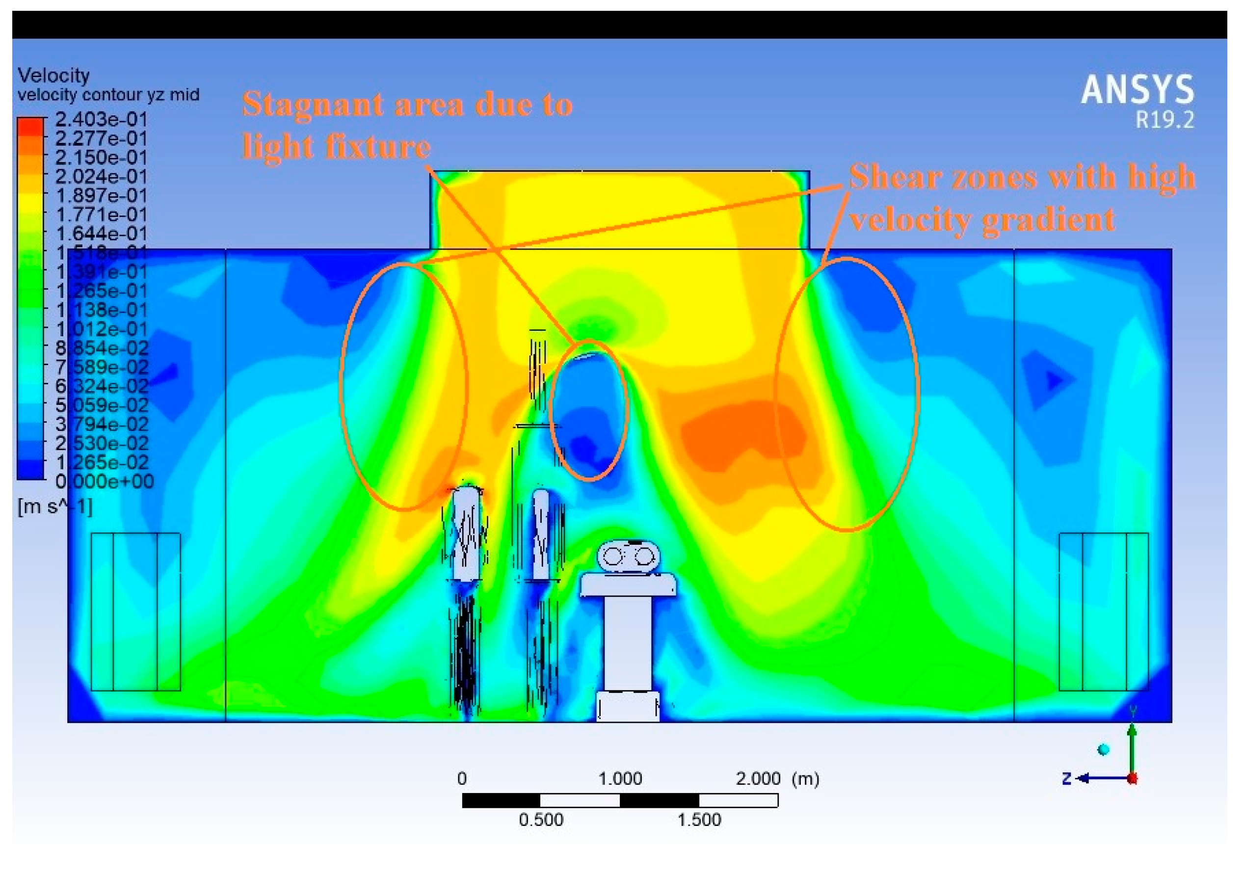 25], in their research paper, have carried out a similar CFD study, mainly focusing on thermal comfort. The study uses a simpler geometry without surgical pendant and lights. The velocity vector plot in the present study (