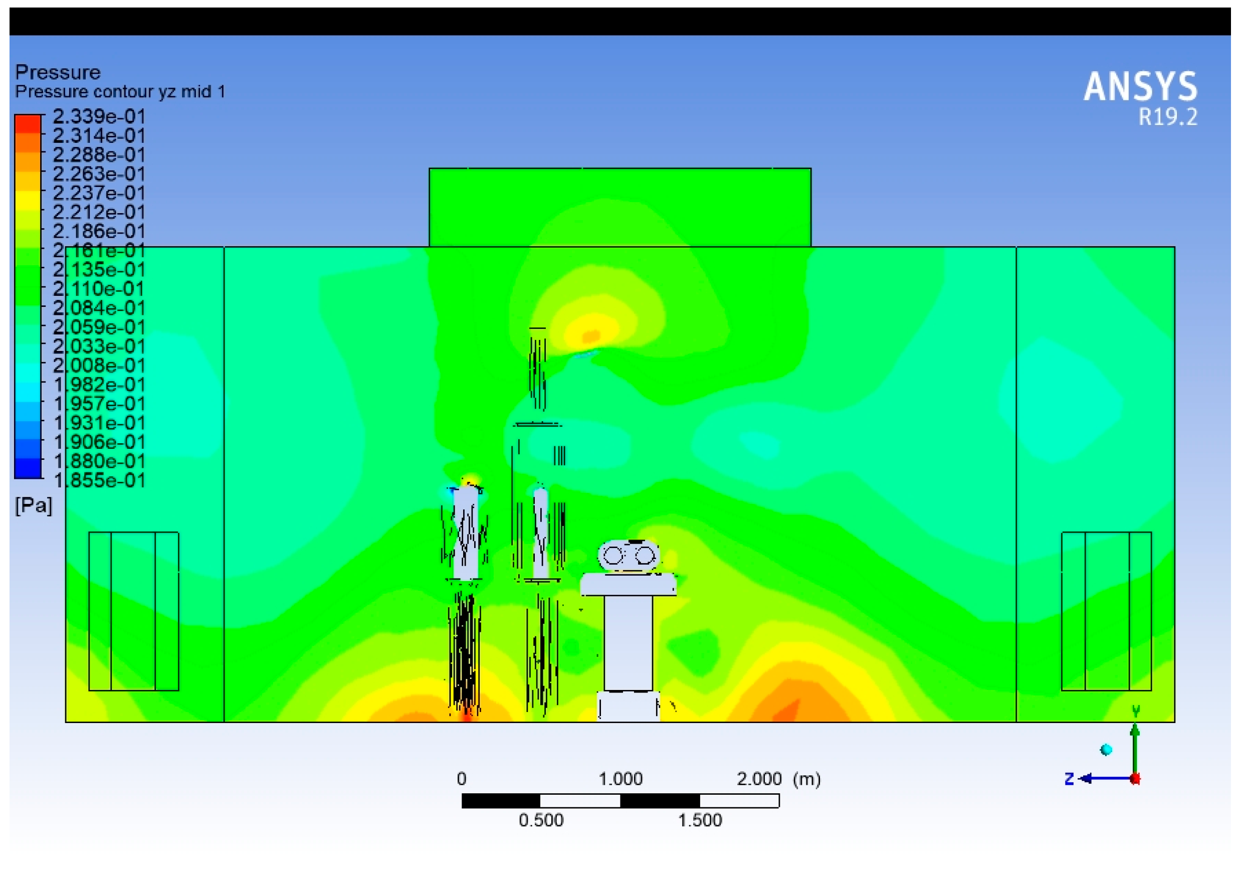 The nearly symmetrical pressure field further implies that diffuser configuration and exhaust placement are properly balanced, contributing to uniform air delivery and minimised stagnation zones. Localised high-pressure regions around equipment and lighting structures are acceptable as long as they do not disrupt the downward laminar airflow, and their influence can be mitigated through diffuser design optimisation.