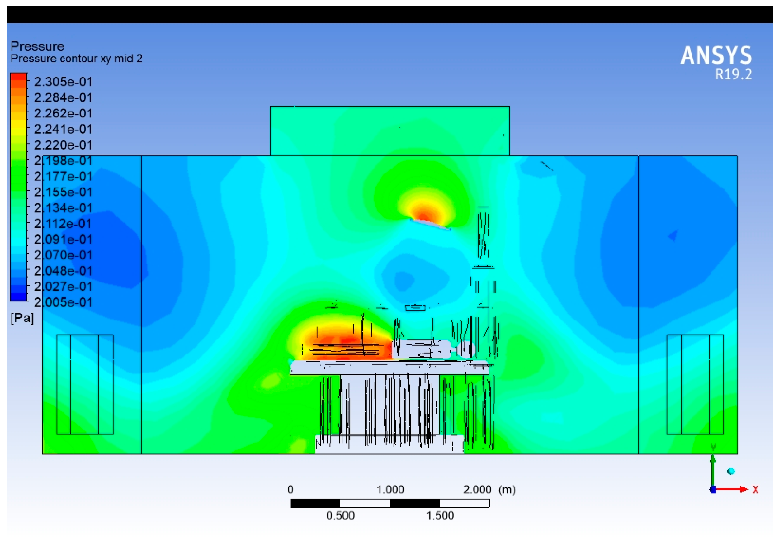 The nearly symmetrical pressure field further implies that diffuser configuration and exhaust placement are properly balanced, contributing to uniform air delivery and minimised stagnation zones. Localised high-pressure regions around equipment and lighting structures are acceptable as long as they do not disrupt the downward laminar airflow, and their influence can be mitigated through diffuser design optimisation.