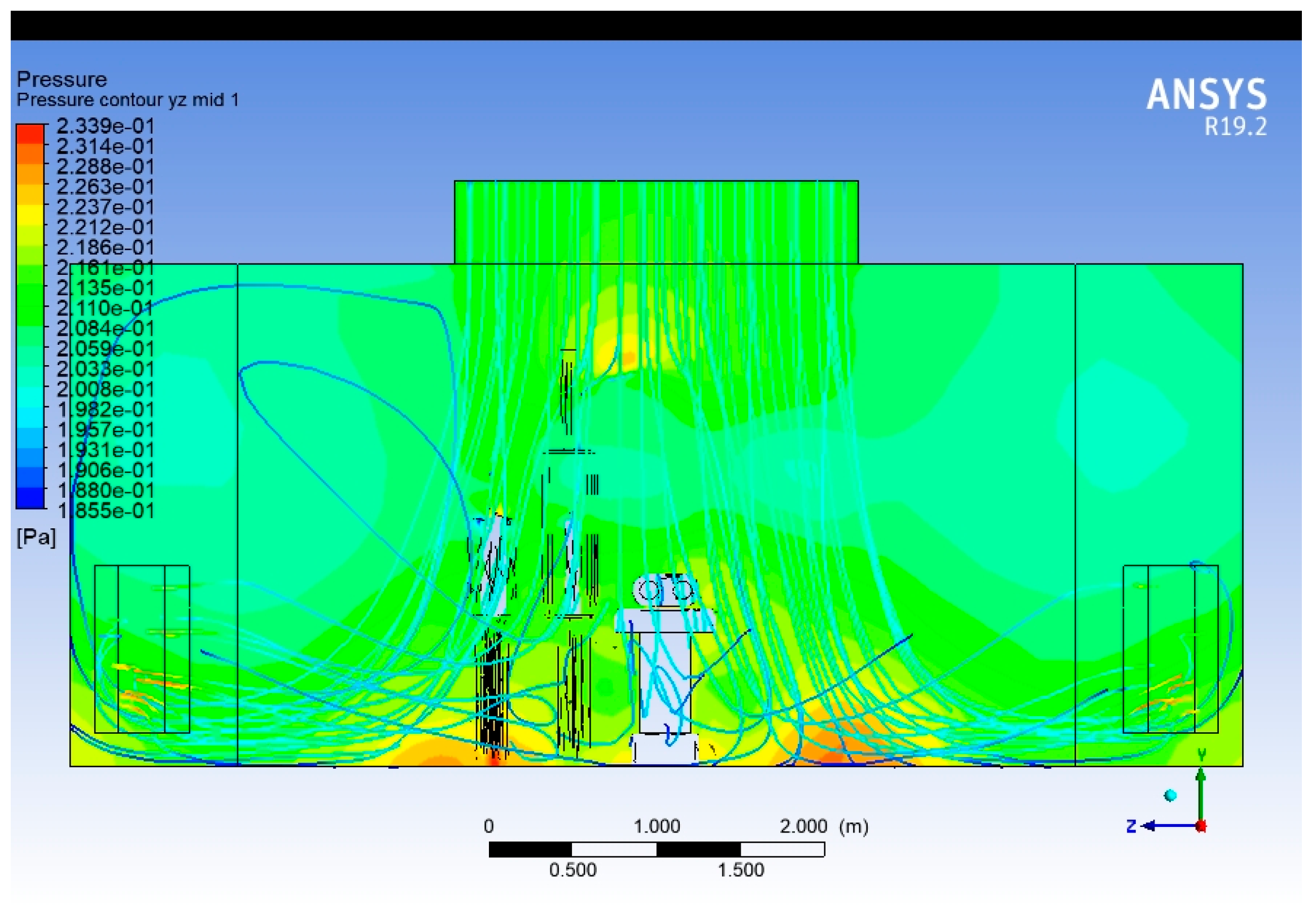 Pressure imbalance across the width suggests that airflow is not equally distributed, which may favour lateral flow or recirculation, undermining the sterility of the central region. A better symmetry in diffuser design and avoiding large lateral pressure gradients will help maintain uniform airflow.