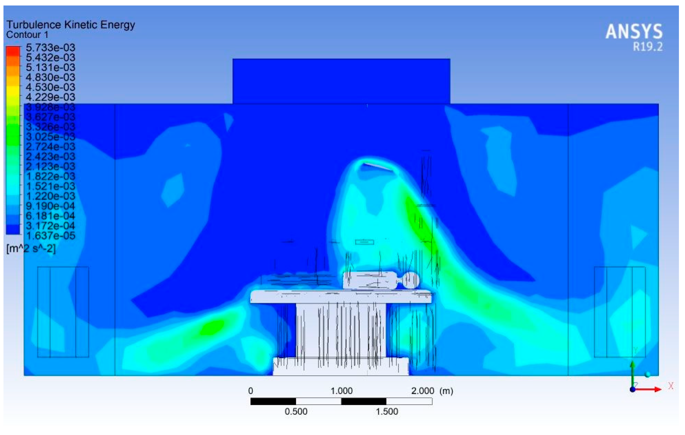 At floor level, near the base of the operating table, moderate TKE levels of 1 × 10−3 to 2 × 10−3 m2/s2 are observed. These values correspond to recirculation pockets commonly formed around large geometrical obstructions. Although they do not directly interact with the surgical zone, such recirculation regions can increase particle residence times near the floor and should be minimised through improved exhaust placement.