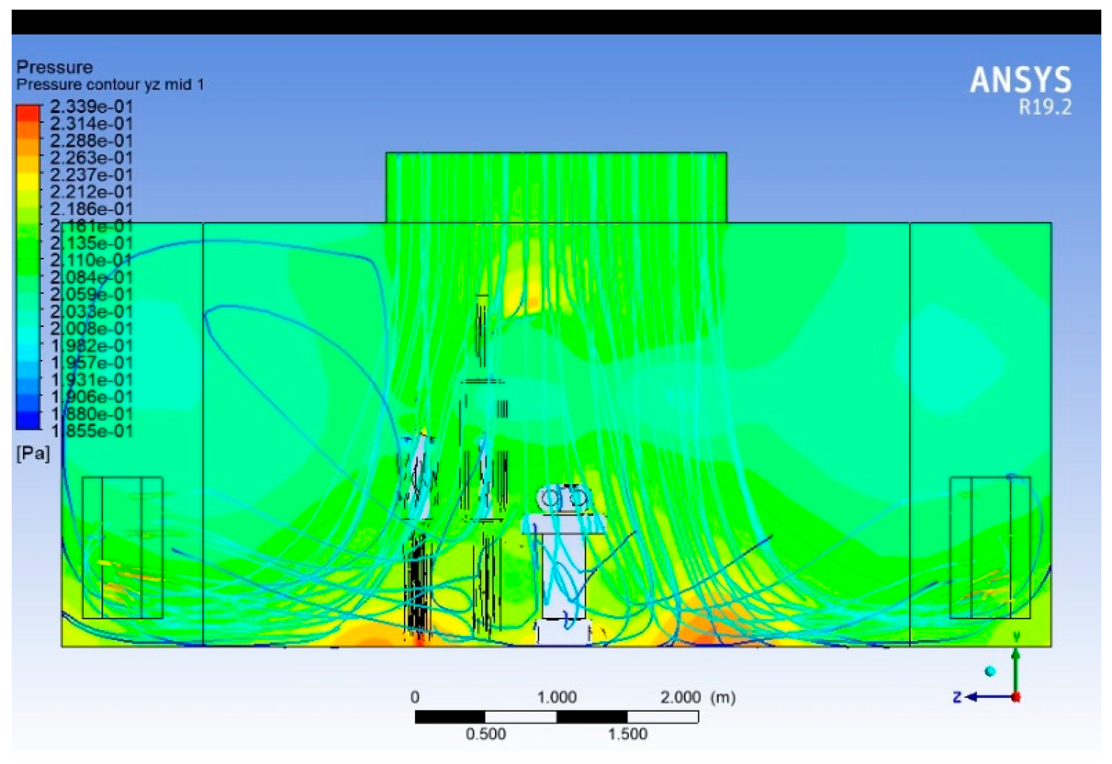 Figure 16 is taken along the length of the operating room, through the vertical midplane of the surgical table. It shows how static pressure varies longitudinally due to ventilation dynamics and obstruction effects. Static pressure shows a gradient, typically where higher-pressure at upstream and lower-pressure in the downstream side of the flow near the returns diffusers.