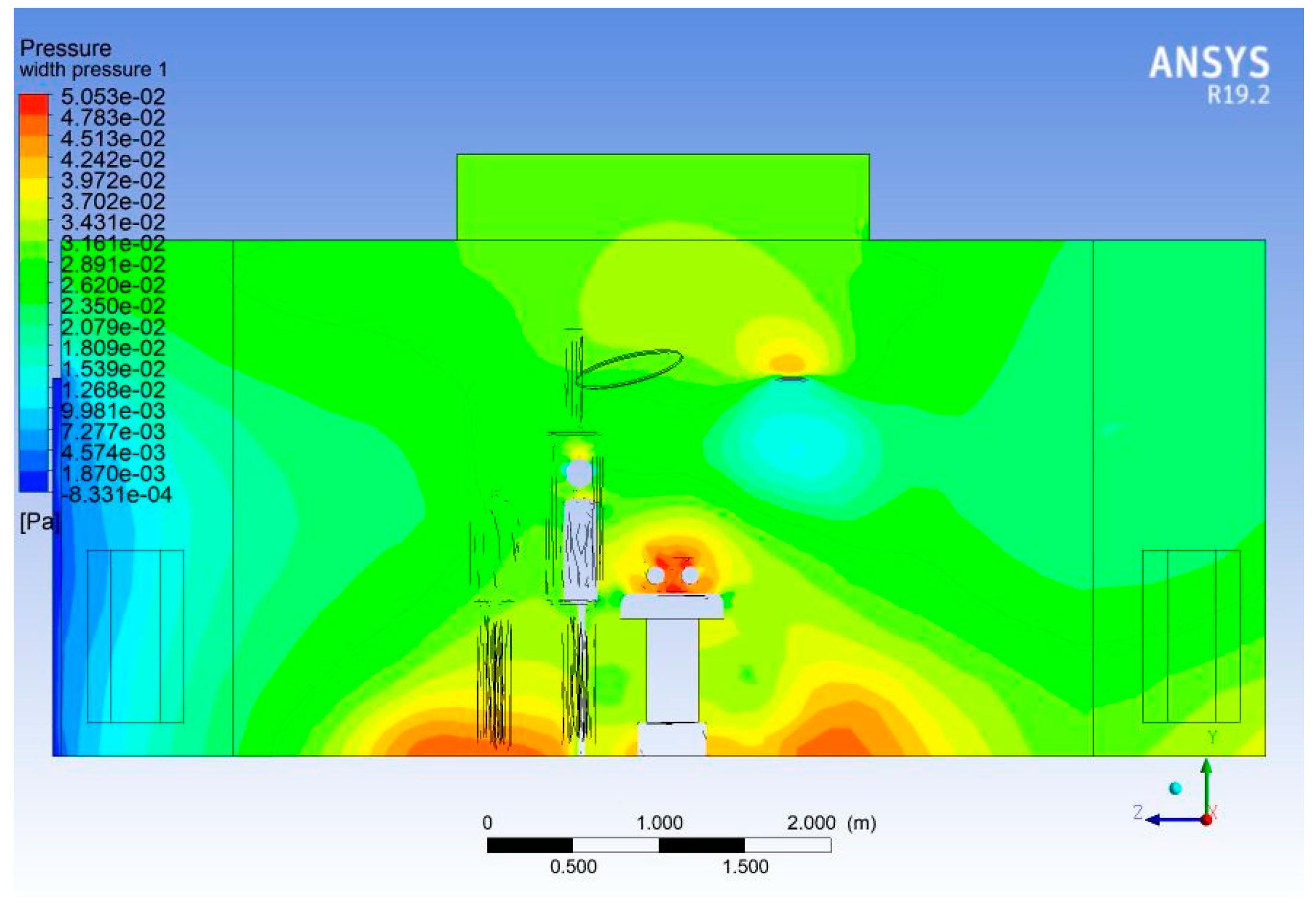 Figure 17 shows pressure distribution on a cross-sectional vertical plane along the width of the operating room, bisecting the surgical table. As with the Lengthwise plot, high-pressure regions are observed beneath supply diffusers. Obstructions and walls cause pressure gradients across the width, with an asymmetrical distribution being present due to layout constraints and flow deflections.