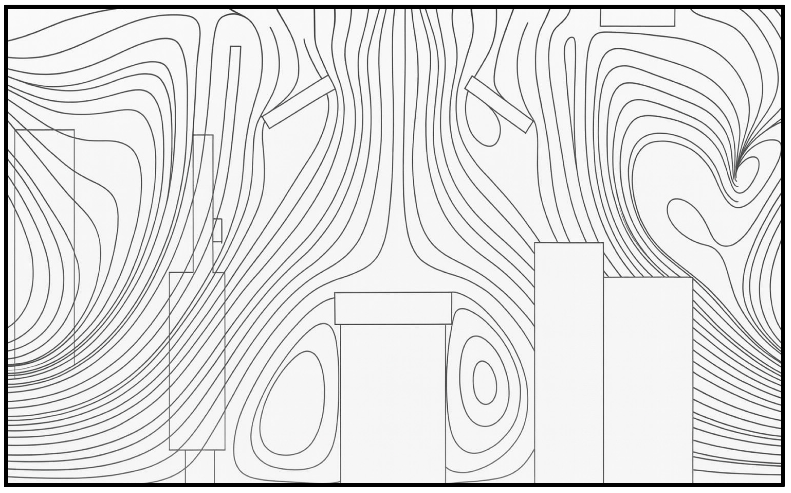 The streamline visualisation makes it evident that the OR airflow design is susceptible to backflow, particularly around obstructions. Zones away from central diffusers show stagnant or poorly directed flow, requiring rebalancing of air delivery. Introducing aerodynamic shaping of overhead fixtures or adding local vertical airflow reinforcements could improve streamline coherence. Simulation-guided positioning of HVAC elements could help eliminate undesirable loops.
