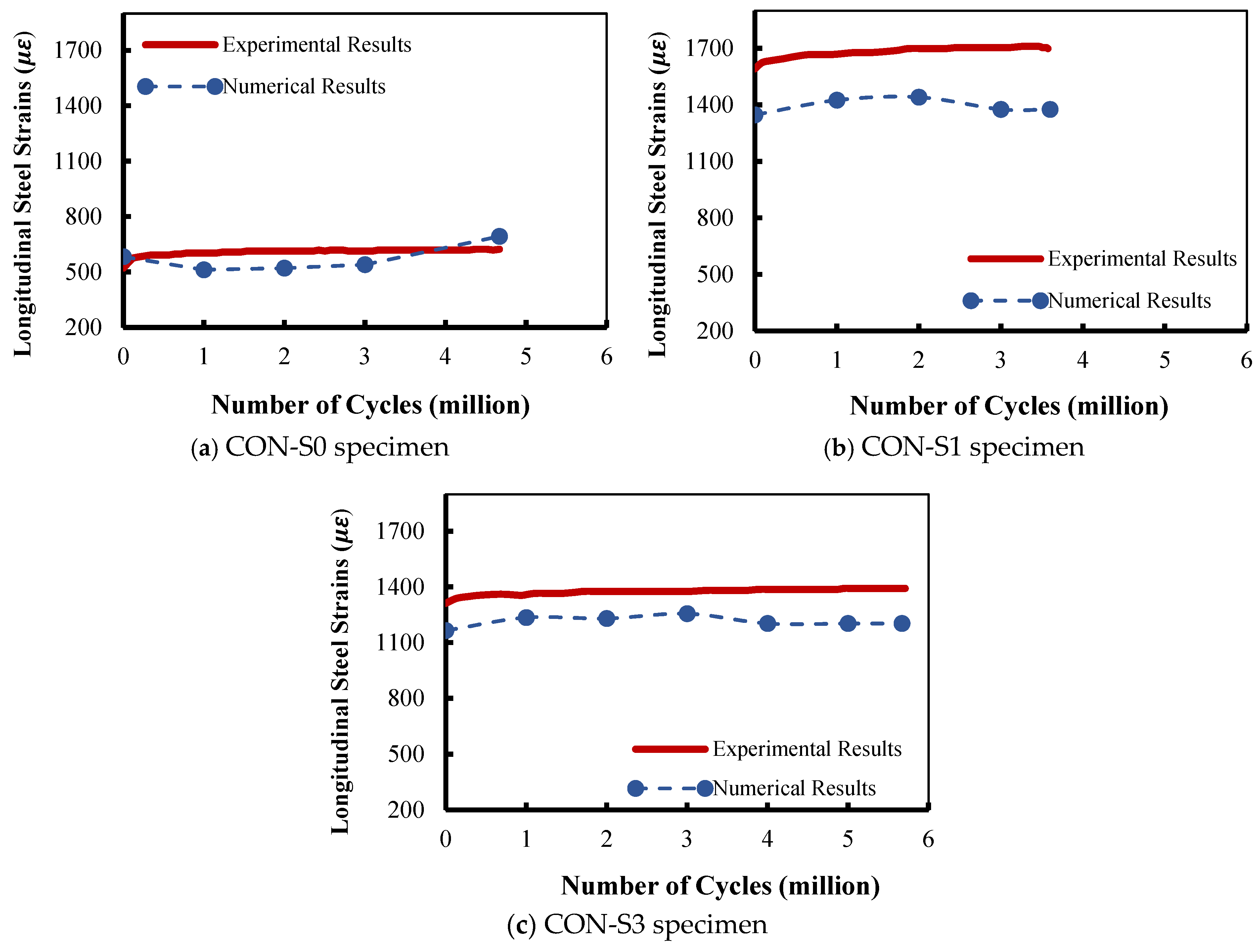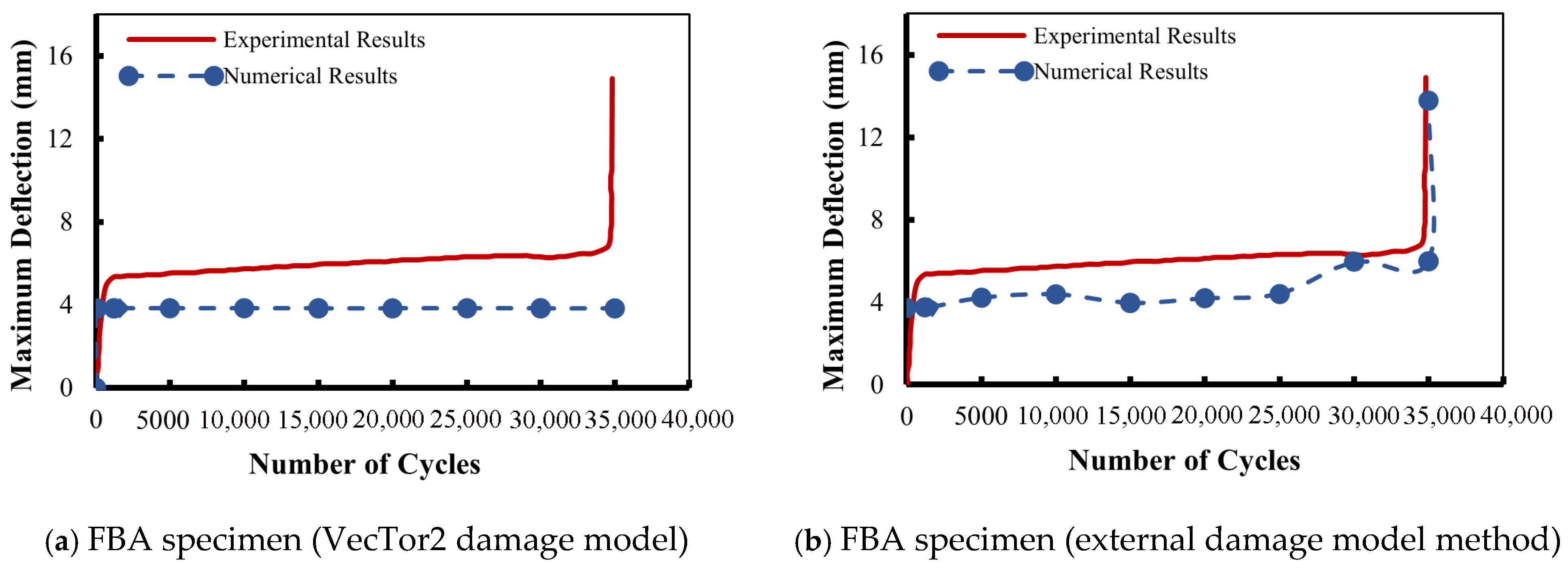 - Isojeh, B.; El-Zeghayar, M.; Vecchio, F. Numerical Analysis of Reinforced Concrete and Steel-Fiber Concrete Elements under Fatigue Loading. J. Struct. Eng. 2019, 145. [Google Scholar] [CrossRef]