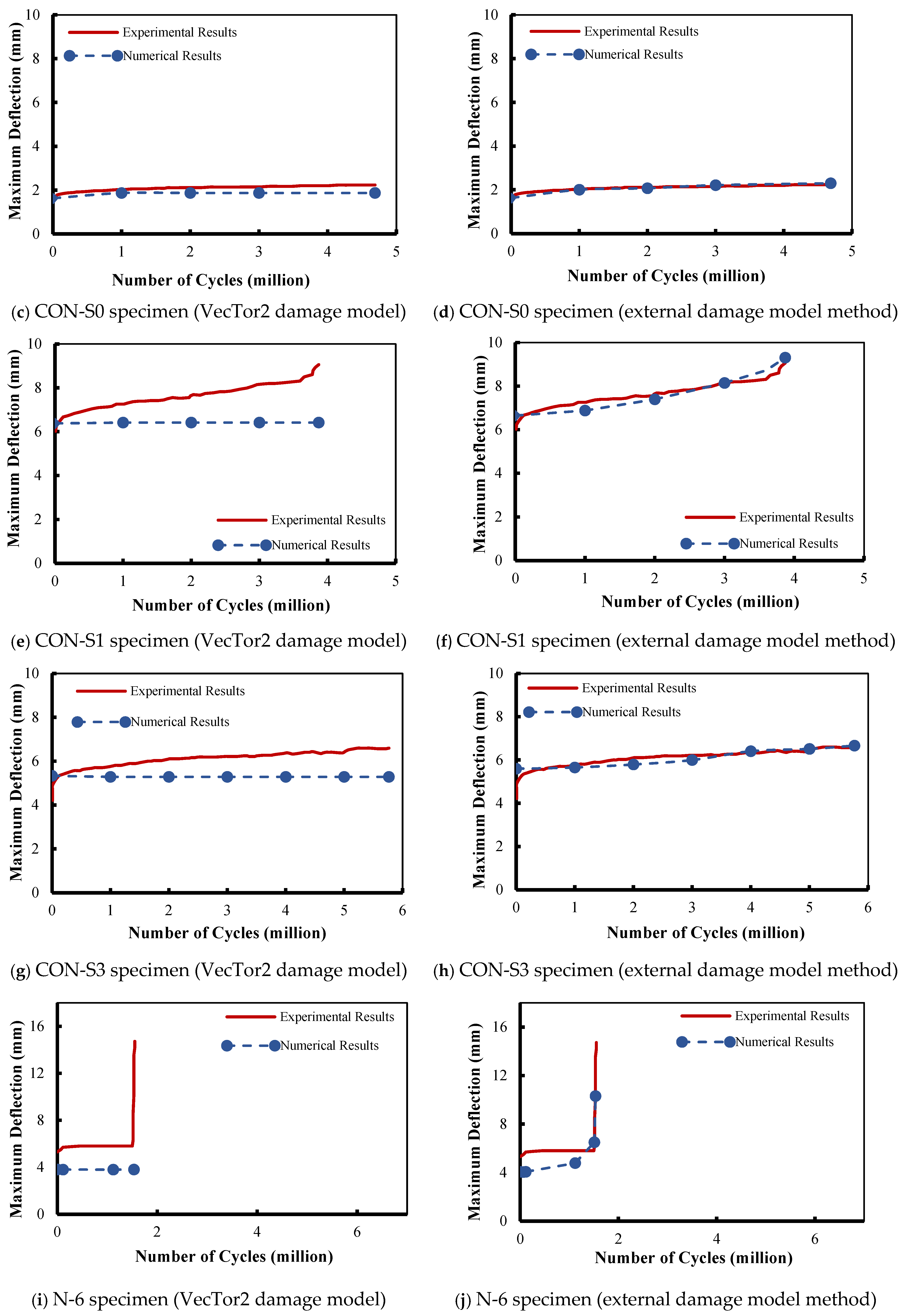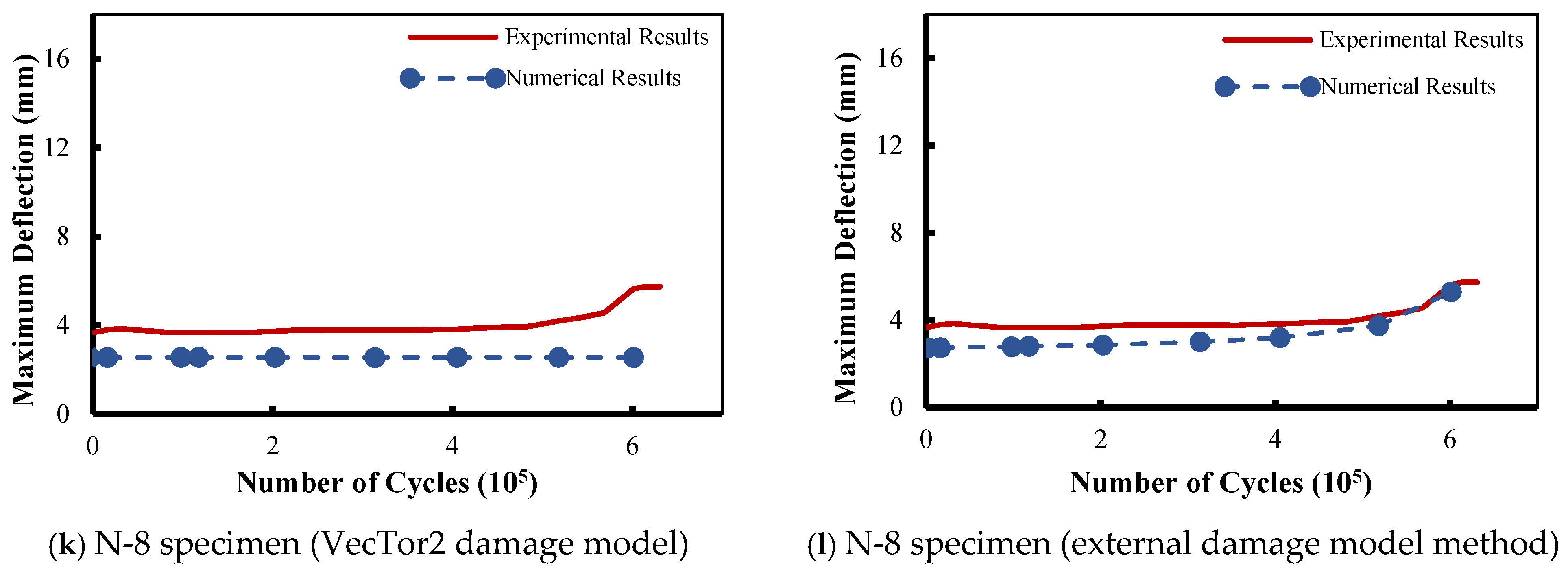 | Specimen | Experimental Results | Numerical Results (VecTor2 Damage Model) | Numerical Results (External Damage Model) | Cycle Number | ||