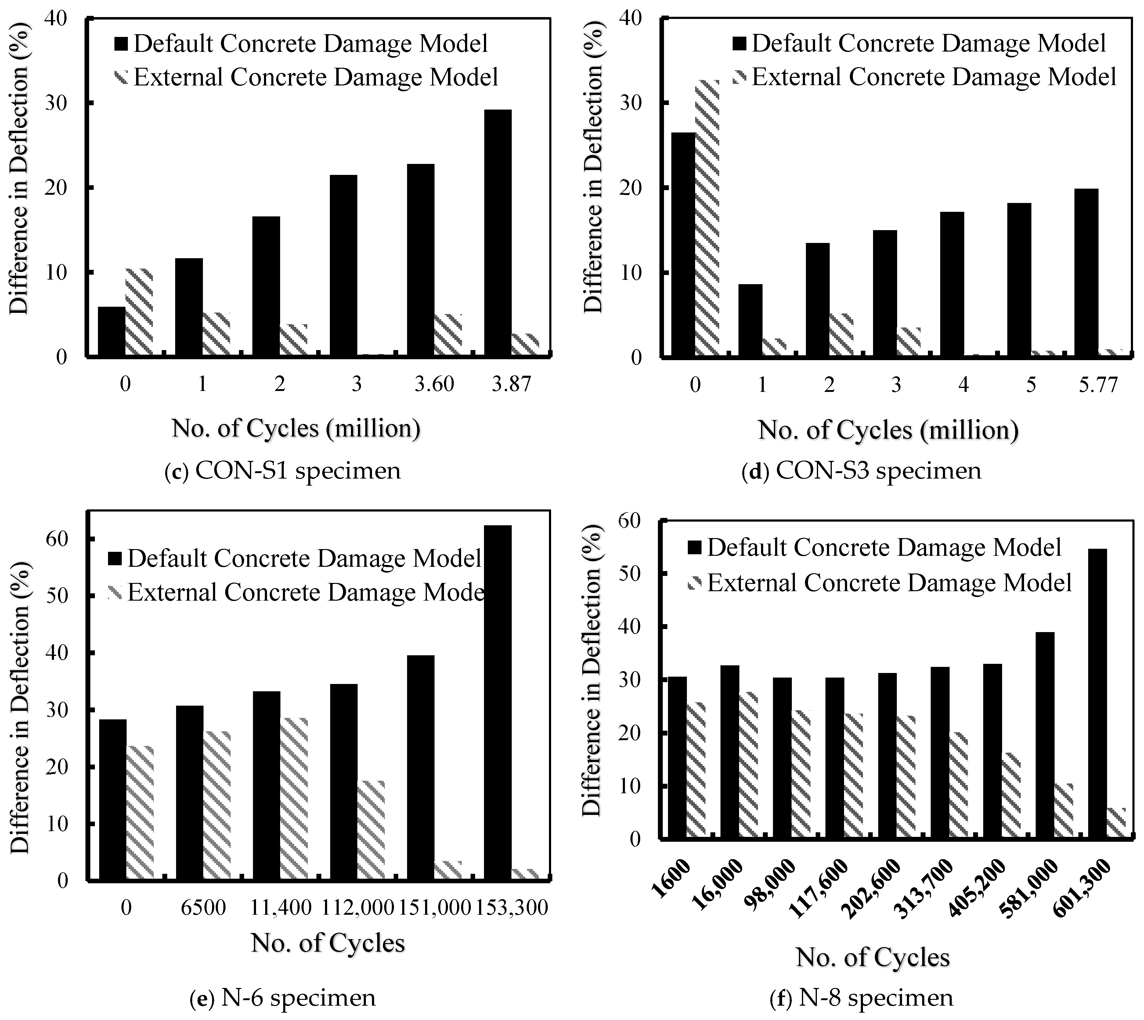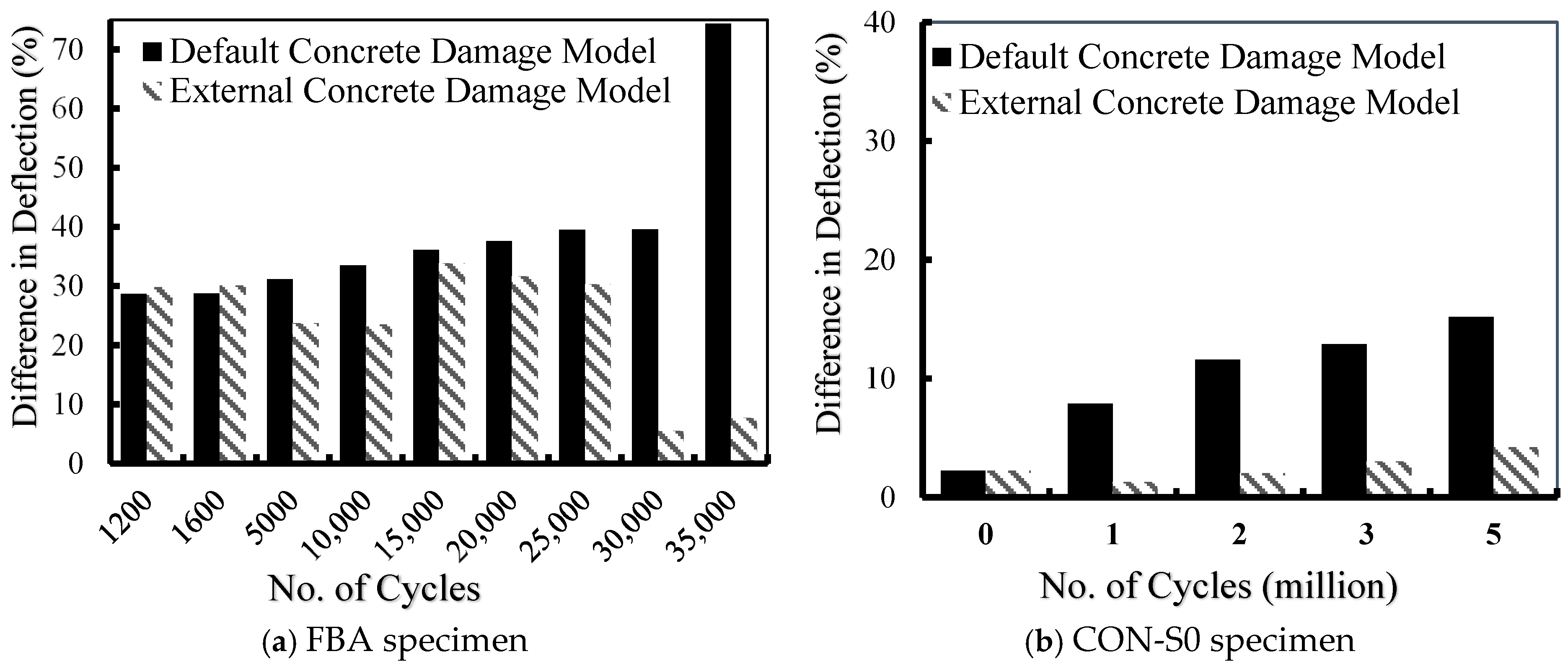 - The VecTor2 concrete damage model was able to capture the fatigue behavior at early load cycles. Wide discrepancies between the FE model results and the experimental ones were observed when the number of cycles increased. This can be attributed to the rotating smeared crack assumption, which affected the stiffness and crack opening under constant-amplitude cyclic loading, resulting in almost constant deflection responses with an increasing number of cycles.