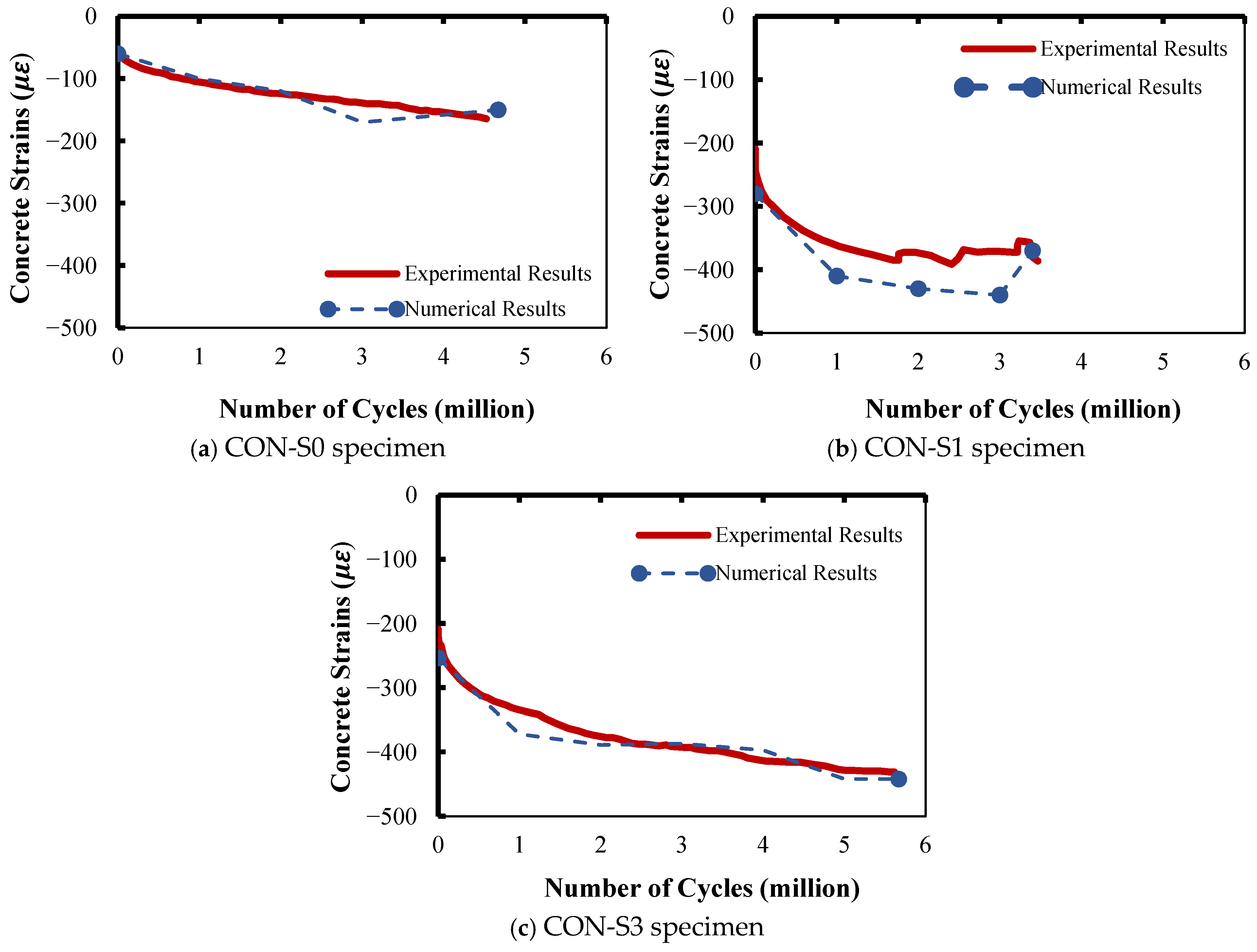 - Liu, F.; Zhou, J. Fatigue Strain and Damage Analysis of Concrete in Reinforced Concrete Beams under Constant Amplitude Fatigue Loading. Shock Vib. 2016, 2016, 1–7. [Google Scholar] [CrossRef]
