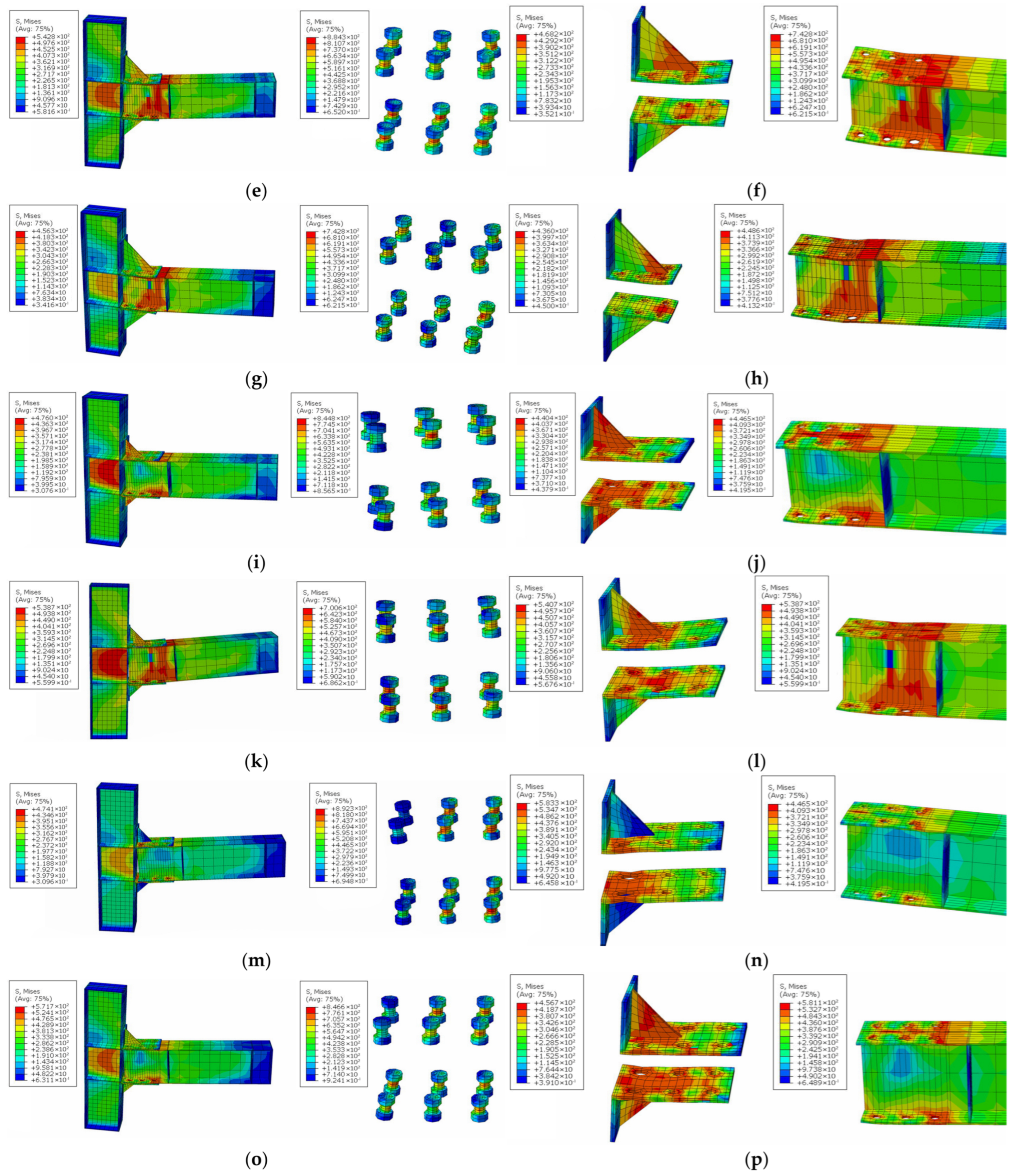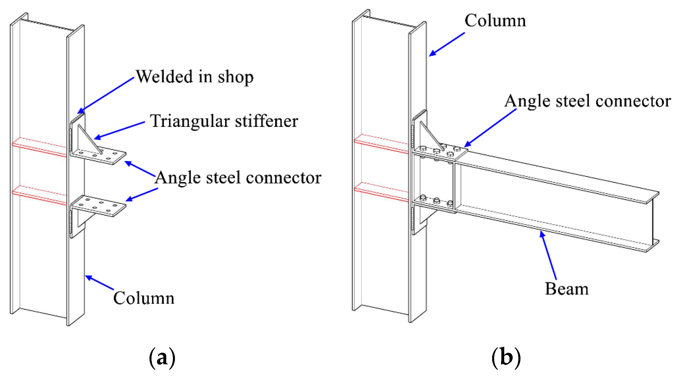 - Liu, X.; Meng, K.; Chen, X.; Li, Y.; Cui, Y. Seismic performance of bolted connection between T-shaped section column and I-section beam with L-stubs. Eng. Struct. 2023, 285, 116022. [Google Scholar] [CrossRef]