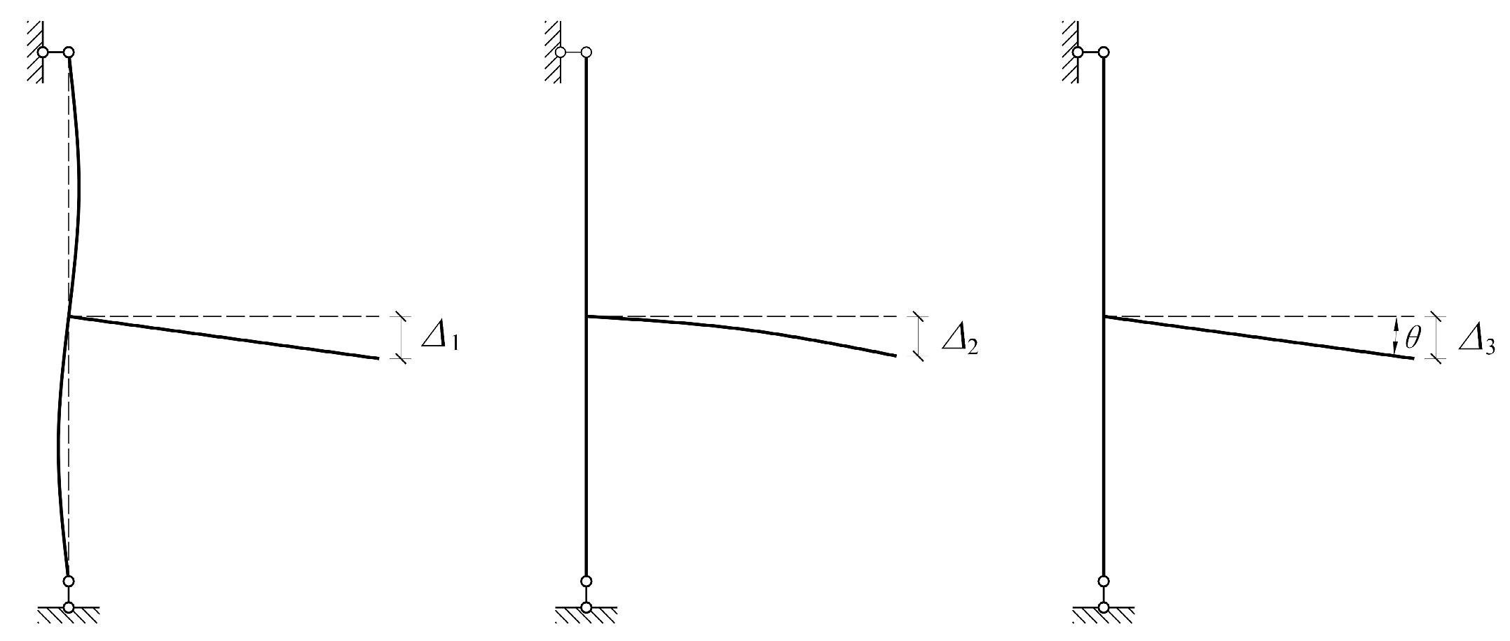 - Vertical displacement Δ3 at the beam end induced by the relative rotation between the beam and column under load P (Equation (3)):