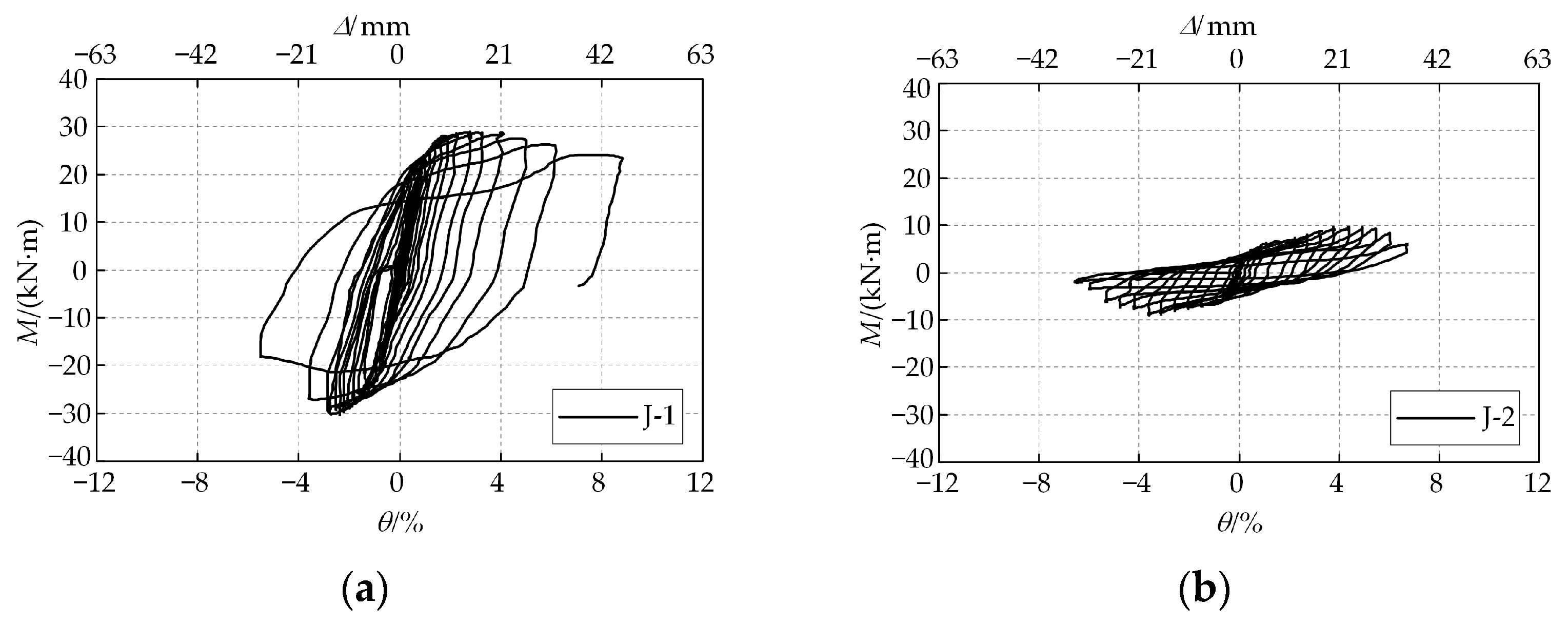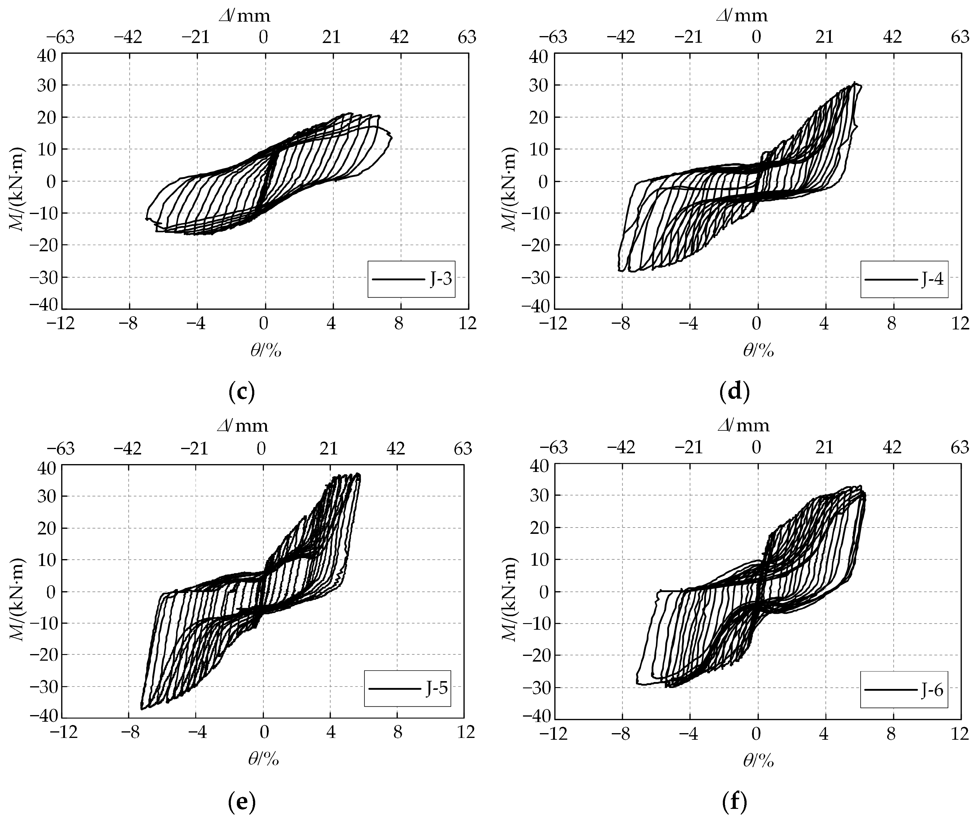- As shown in Figure 8b, the skeleton curves of J-4, J-5, and J-6 were generally similar. Their peak moments occurred later, and they maintained substantial load-carrying capacity even at large rotation angles. The SQC for J-5 was 1.15 times that of J-4, while the peak moment and the ultimate moment for J-5 increased by 27.9% and 37.7%, respectively. This demonstrated that the incorporation of stiffeners could significantly enhance both the strength and the deformation capacity of this connection type. Although the SQC of J-5 was only 88% of that exhibited by J-6, its peak and ultimate moments were 17.1% and 27.7% higher, respectively. Therefore, when considering both economic and mechanical performance, J-5 represents a more favorable option.