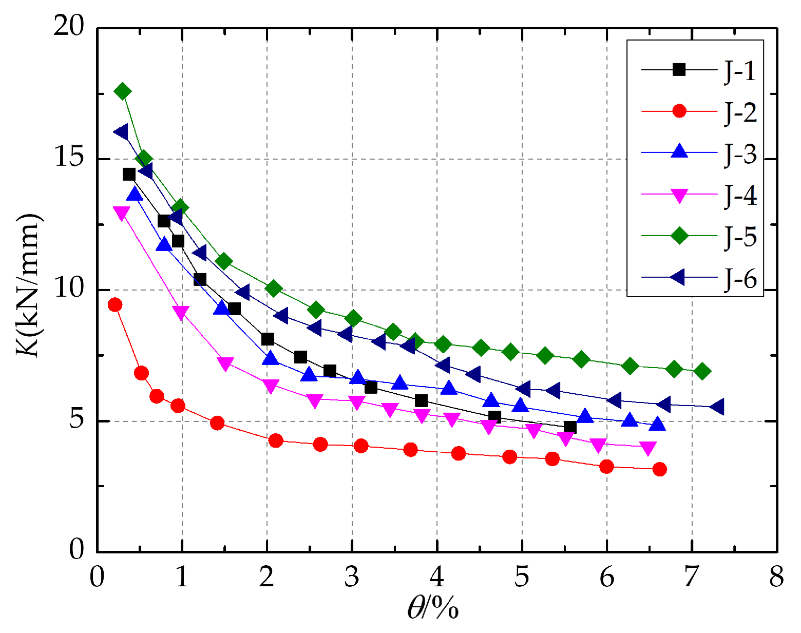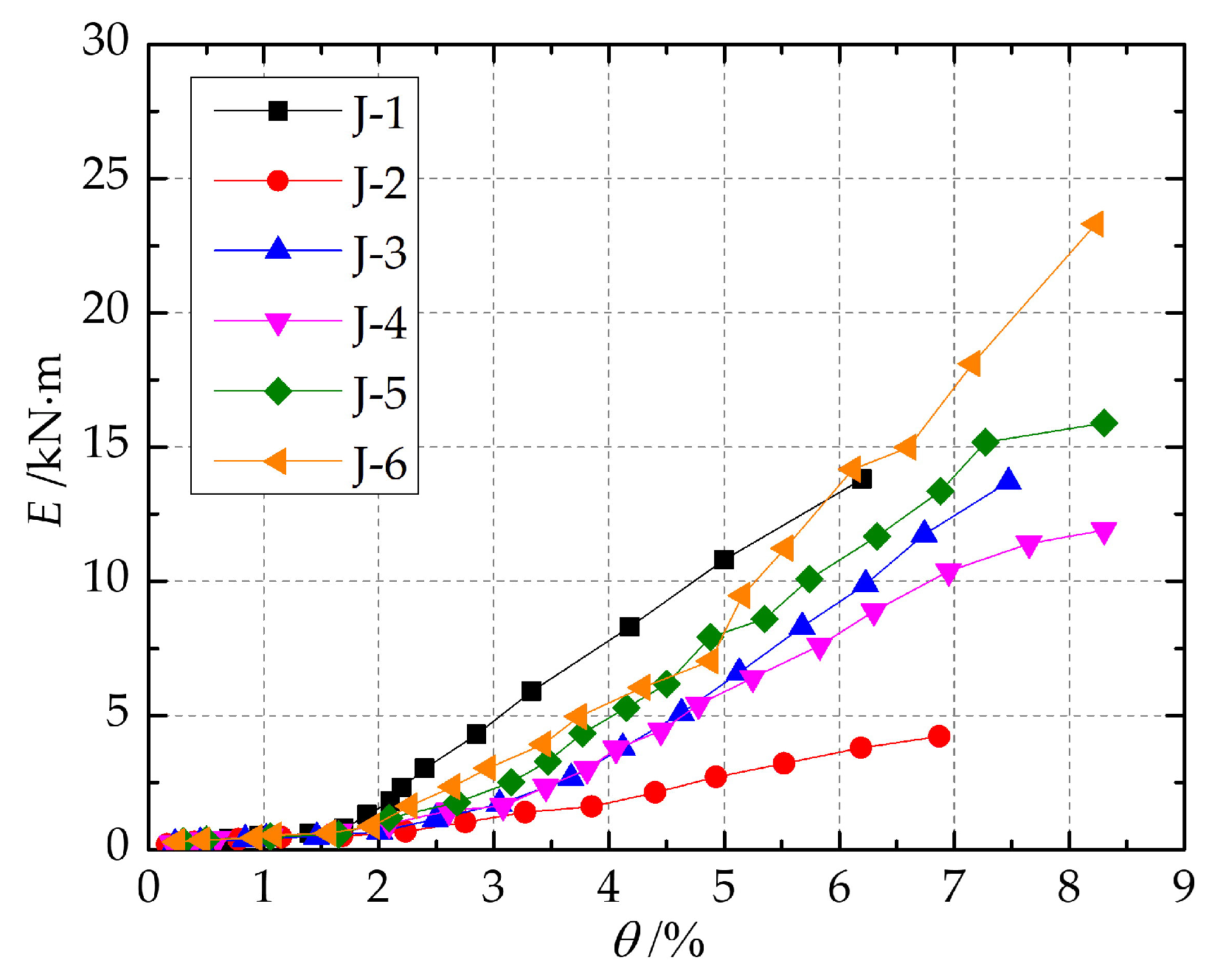 - The mean ductility factors (μ) of all specimens under both positive and negative loading directions exceeded 3. Among them, J-5 and J-6 exhibited the smallest difference between the positive and negative directions, demonstrating good and stable plastic deformation capacity.