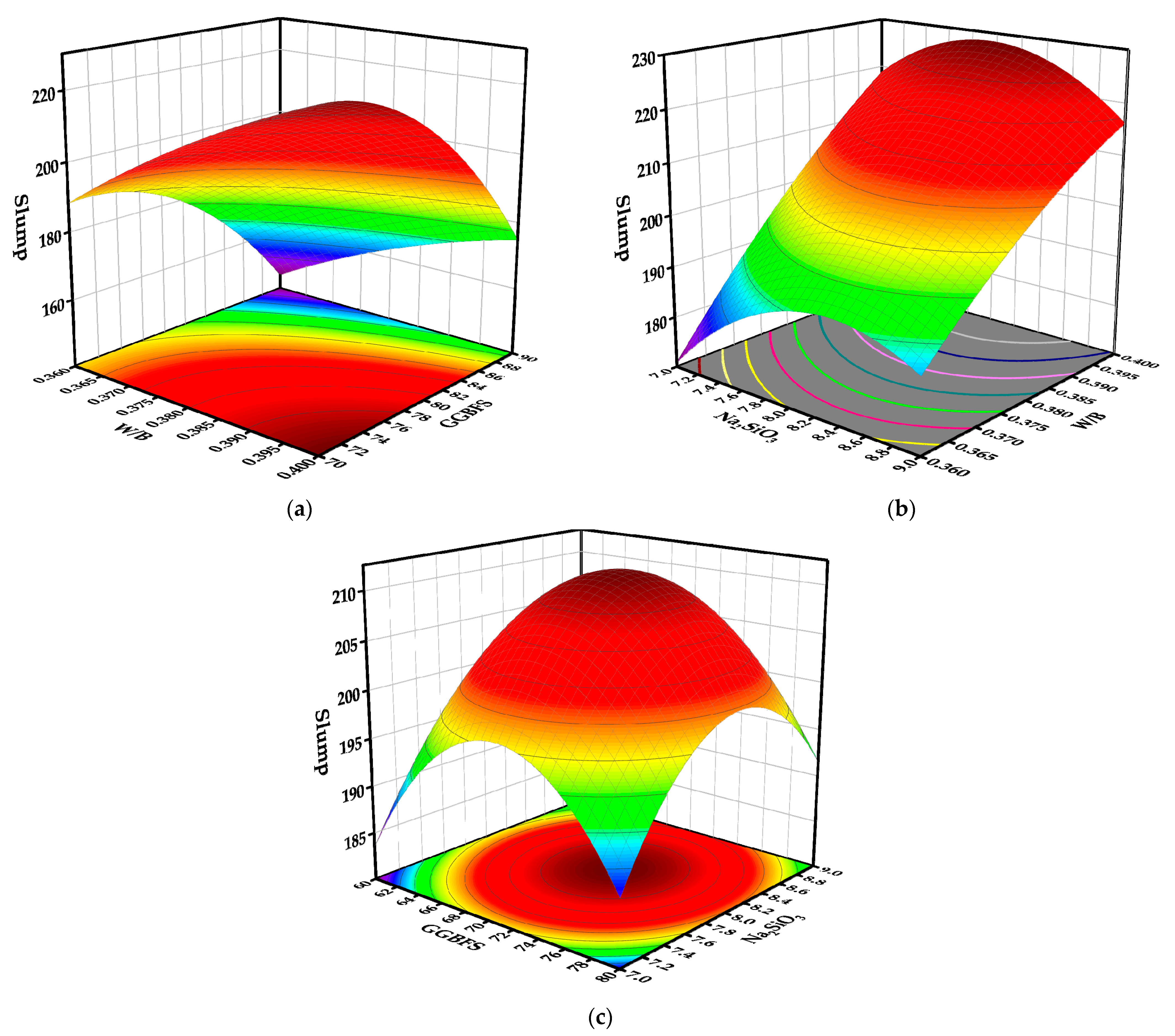 - Zhao, G.; Pan, X.; Yan, H.; Tian, J.; Han, Y.; Guan, H.; Ruan, Y.; Liu, B.; Chen, F. Optimization and characterization of GGBFS-FA based alkali-activated CLSM containing Shield-discharged soil using Box-Behnken response surface design method. Case Stud. Constr. Mater. 2024, 21, e03800. [Google Scholar] [CrossRef]