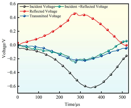 During SHPB testing, stress uniformity across both ends of the concrete specimen must be ensured. Figure 2 shows the stress equilibrium verification curve for the concrete specimen, where the three-wave method was applied to examine the voltage amplitude signals for stress balance. As shown in Figure 2, the sum of the incident and reflected signal voltages aligns closely with the transmitted signal voltage in the test, indicating that the stress state in the specimen essentially satisfies the assumption of stress equilibrium. This alignment confirms that specimen preparation and testing meet the requirements for the one-dimensional stress wave assumption, as well as for minimizing end friction and inertial effects in SHPB experiments. Consequently, the concrete specimen demonstrates satisfactory stress uniformity during SHPB testing.