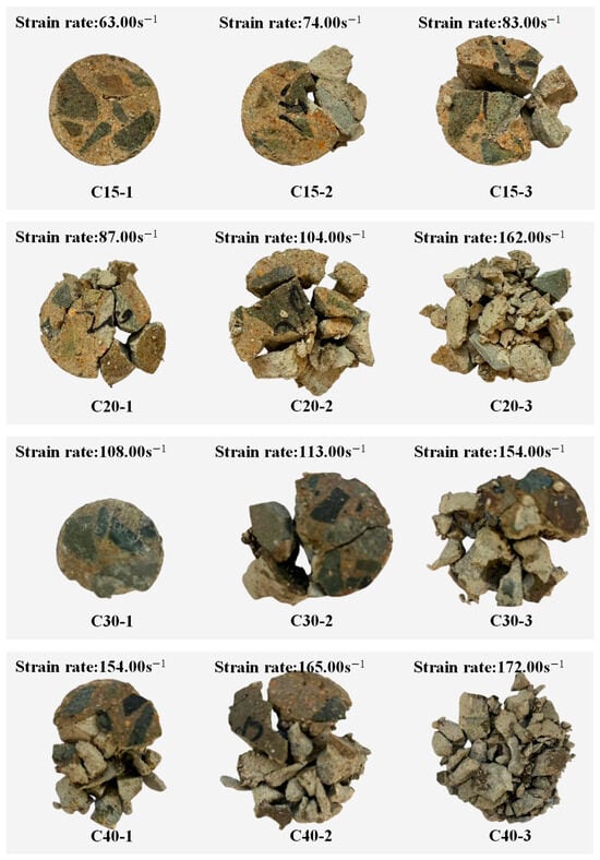 Table 1 shows the dynamic mechanical parameters of concrete specimen under different strain rates, Figure 3 shows the fracture conditions of different grade concrete under different strain rates, and Figure 4 shows the stress–strain curves of different grade concrete under different loading rates.