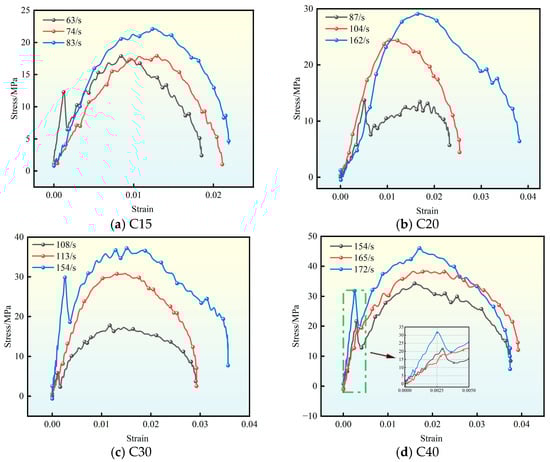 As shown in Figure 4d, taking C40 concrete specimen with clear curve as an example for concrete analysis, the elastic stage is about strain 0–0.003, the stress increases linearly with strain, and the incident energy is converted into elastic energy and stored in the specimen; At strain 0.003–0.02, the elastic–plastic stage, the slope of the curve decreases continuously until it reaches the peak stress. At this stage, the crack begins to develop at the weakest point of the material, and the damage accumulates continuously with the increase in strain. After strain 0.02, the stress decreases with strain increasing, and scattered cracks begin to propagate, connect, and penetrate, forming macroscopic fracture surface, and dynamic compressive strength loses in this stage, structural integrity loses, and gradually cracks begin to fracture.