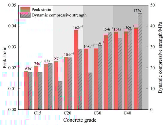 Figure 5 illustrates the variation trends of peak strain and dynamic compressive strength across concrete strength grades. During dynamic impact, both parameters generally increase with concrete grade. As shown in Figure 3, for specimens of the same grade, peak strain rises with the severity of fragmentation. Specifically, the peak strain of C40-3 should not exceed 0.0393, indicating the most severe degree of fracture. Overall, peak strain exhibits a progressive increase with both concrete strength grade and applied strain rate, whereas dynamic compressive strength is more strongly governed by loading conditions. Among all grades, C30 specimens display the most pronounced response, accompanied by a progressively intensifying damage pattern. Notably, for a given grade, higher dynamic compressive strength—induced by elevated strain rates—correlates with more severe fragmentation. Moreover, the sensitivity of dynamic compressive strength to strain rate diminishes as the concrete strength grade increases. Specifically, the dynamic compressive strength of C15-3 is 22.10 MPa, representing an increase of approximately 47.3%, while that of C40-3 is 46 MPa, showing an increase of approximately 15%.